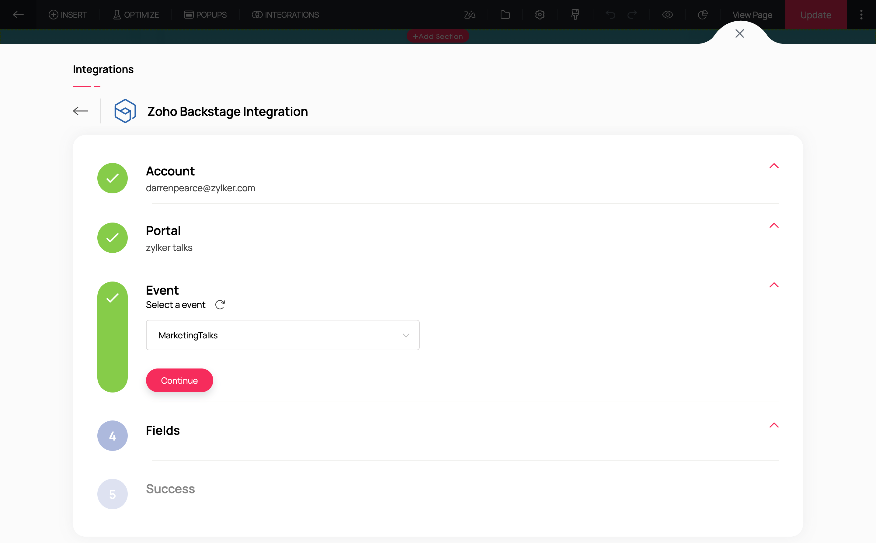 Zoho LandingPageと連携する前に、Backstageポータルでイベントを作成してください。すべてのBackstageイベントがドロップダウンリストで選択できるよう表示されます。