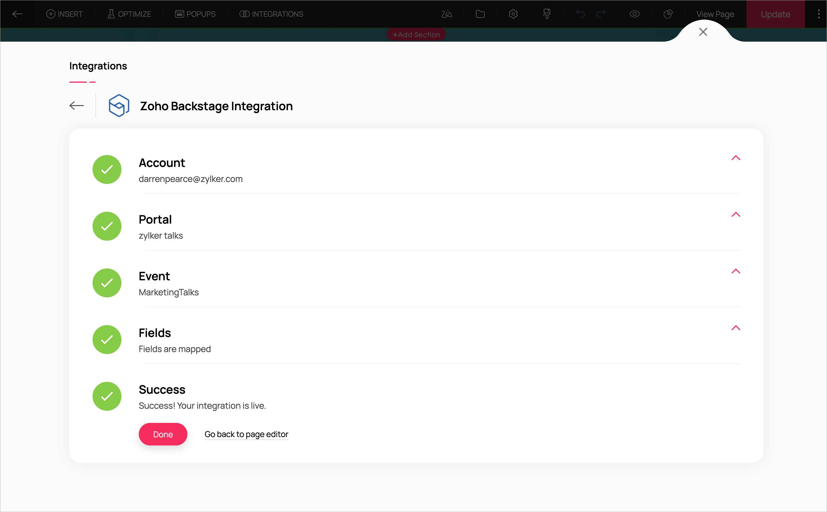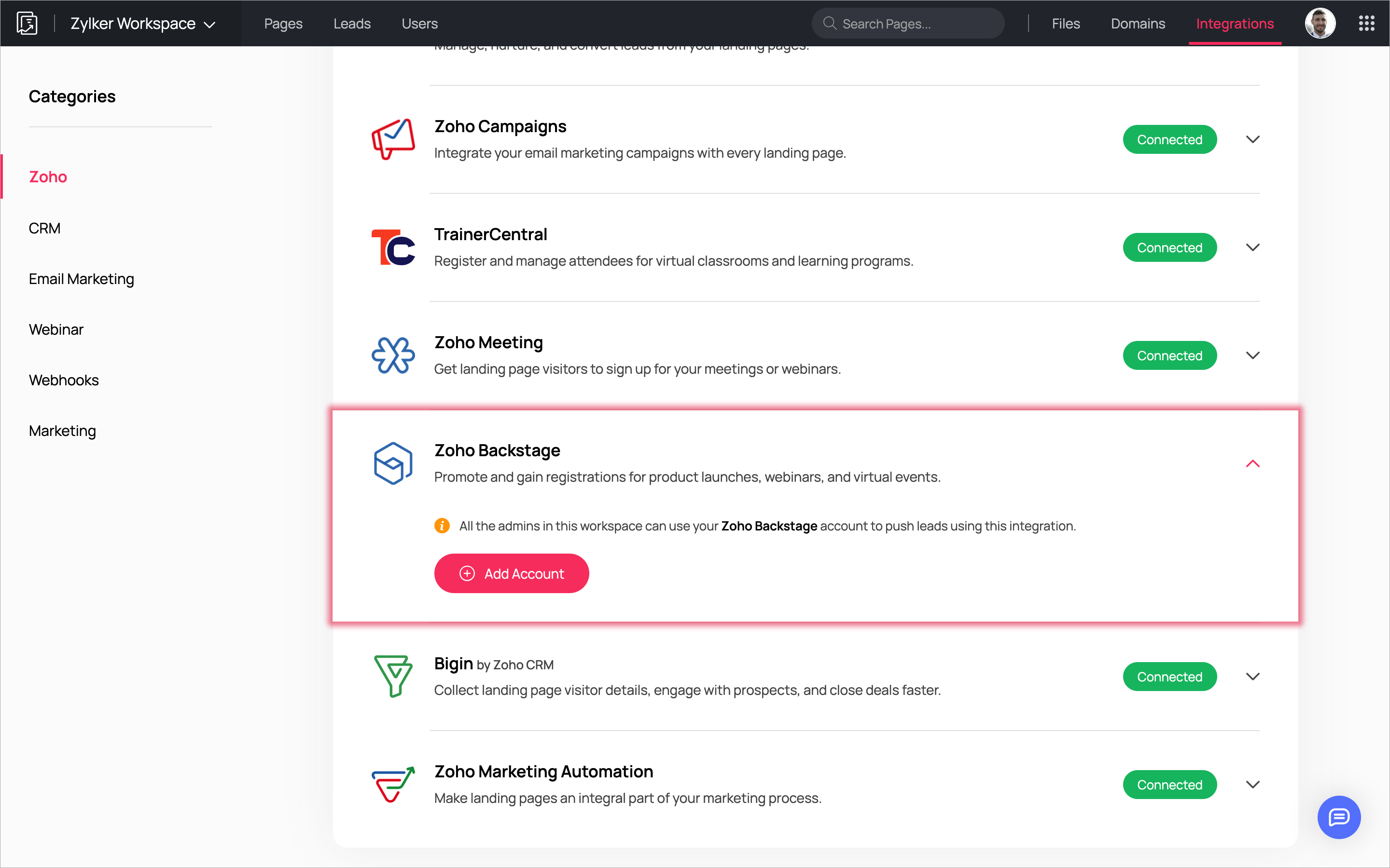 Zoho BackstageをZoho LandingPageアカウントと接続する