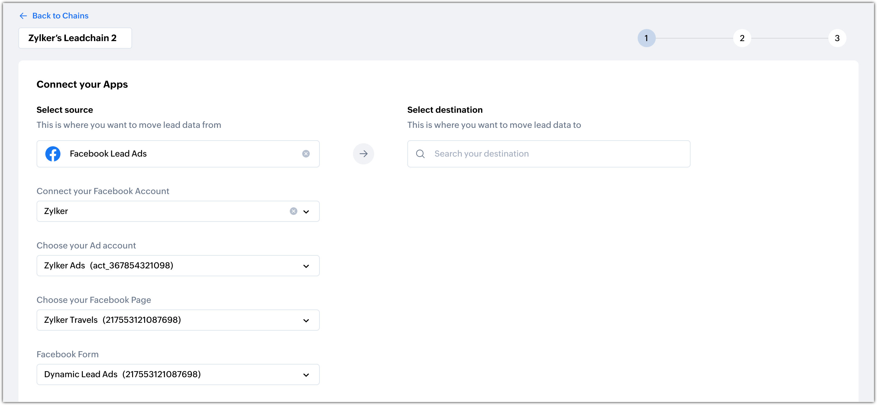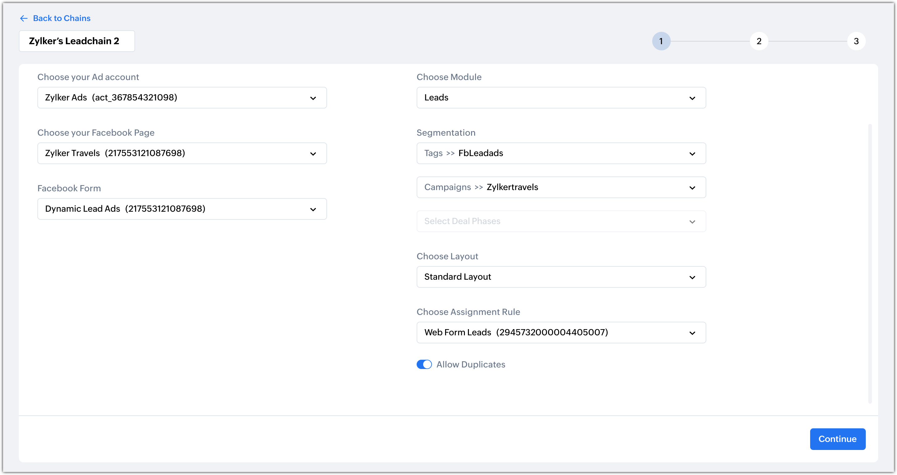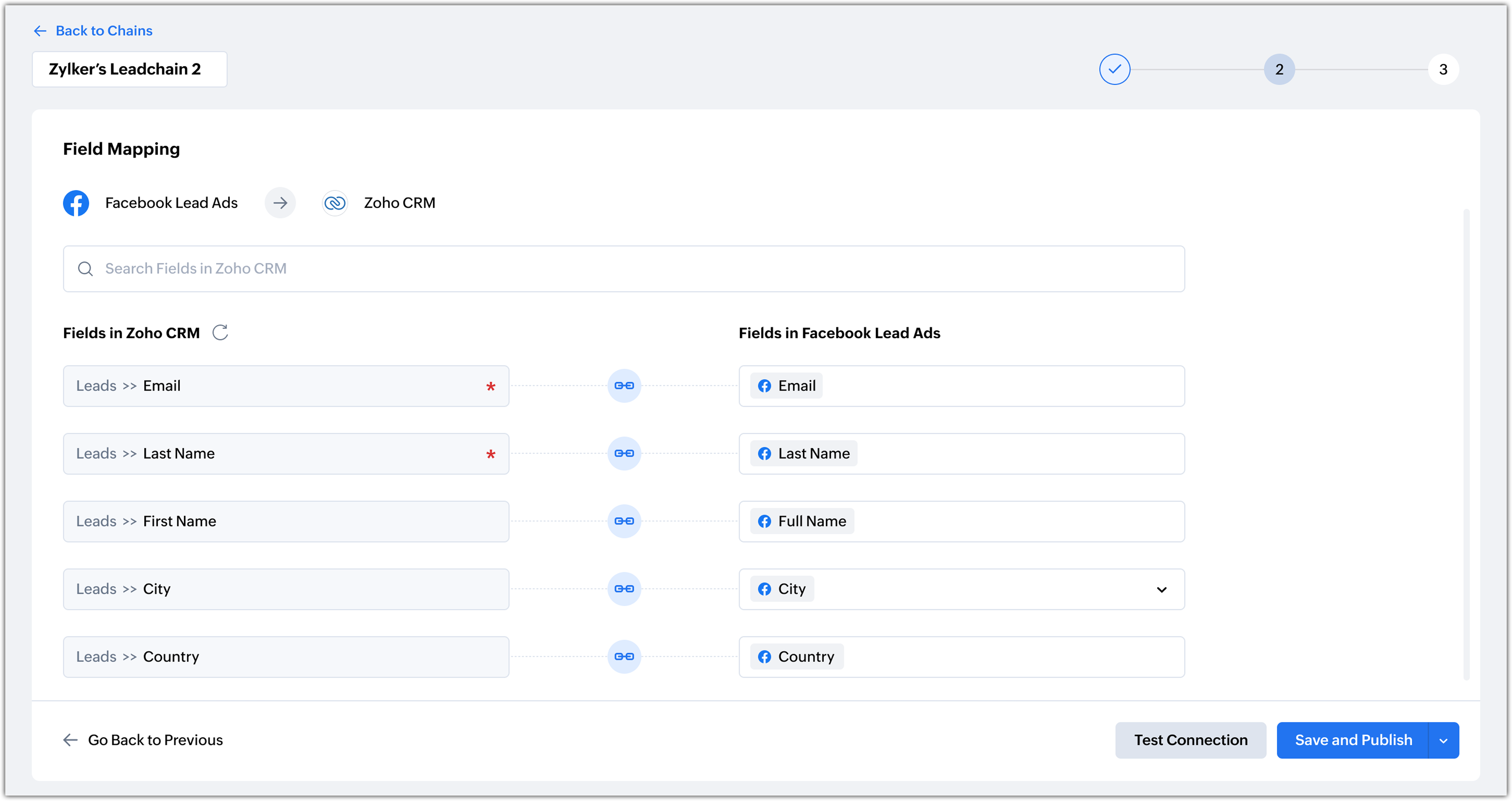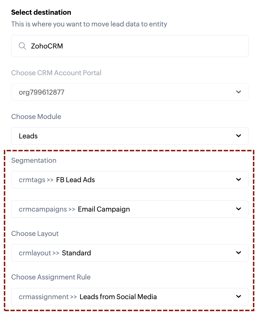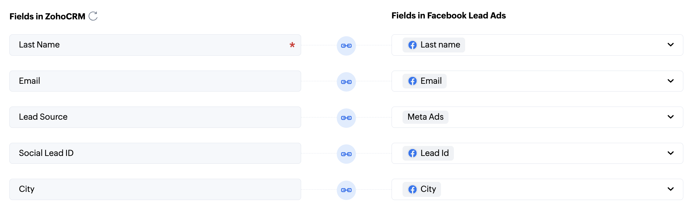 このステージでは、Facebook Lead Adsフォーム内のすべての項目をZoho CRM内の適切な項目にマッピングできます。これにより、リードや連絡先のデータがCRMにどのように取り込まれるかが定義されます。Zoho CRMの該当項目とFacebook Lead Adsの項目を紐付けるか、または項目に初期値を設定することも可能です。たとえば、Zoho CRMには「Lead データ元」項目があり、見込み客がどの経路からCRMに入力されたかを特定・追跡できます。ここで初期値として「Facebook Lead Ads」を設定しておくと、Lead Adsから作成された見込み客の「Lead データ元」は自動的に「Facebook Lead Ads」となり、識別が容易になります。