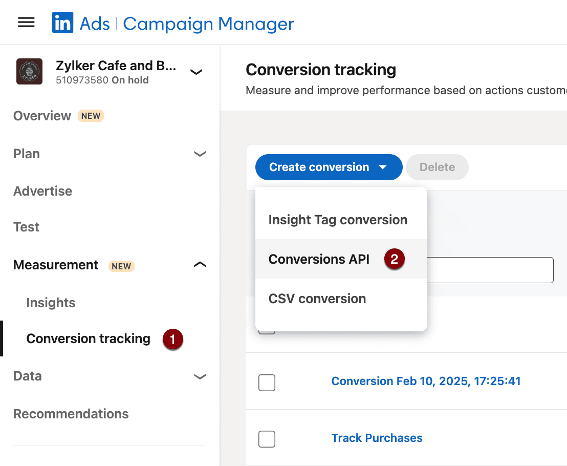 - LinkedIn Campaign Manager で Measurement > Conversion Tracking に移動します。