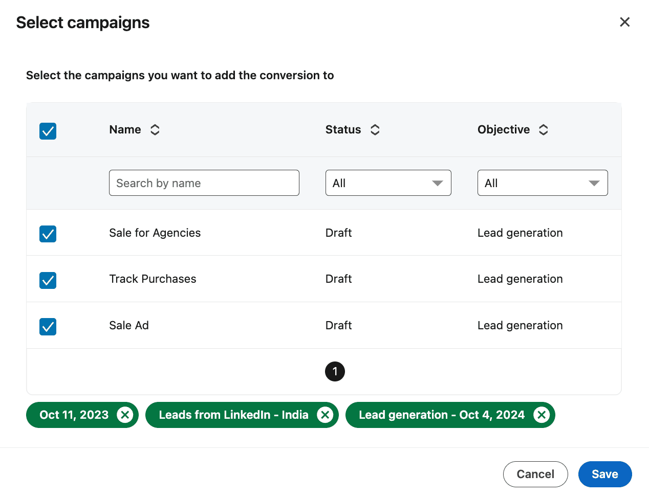 作成したコンバージョンルールは、選択したコンバージョンカテゴリに基づいて、LinkedIn 上で作成済みのキャンペーンに自動的に関連付けられます。必要に応じて確認し、カスタマイズできます。