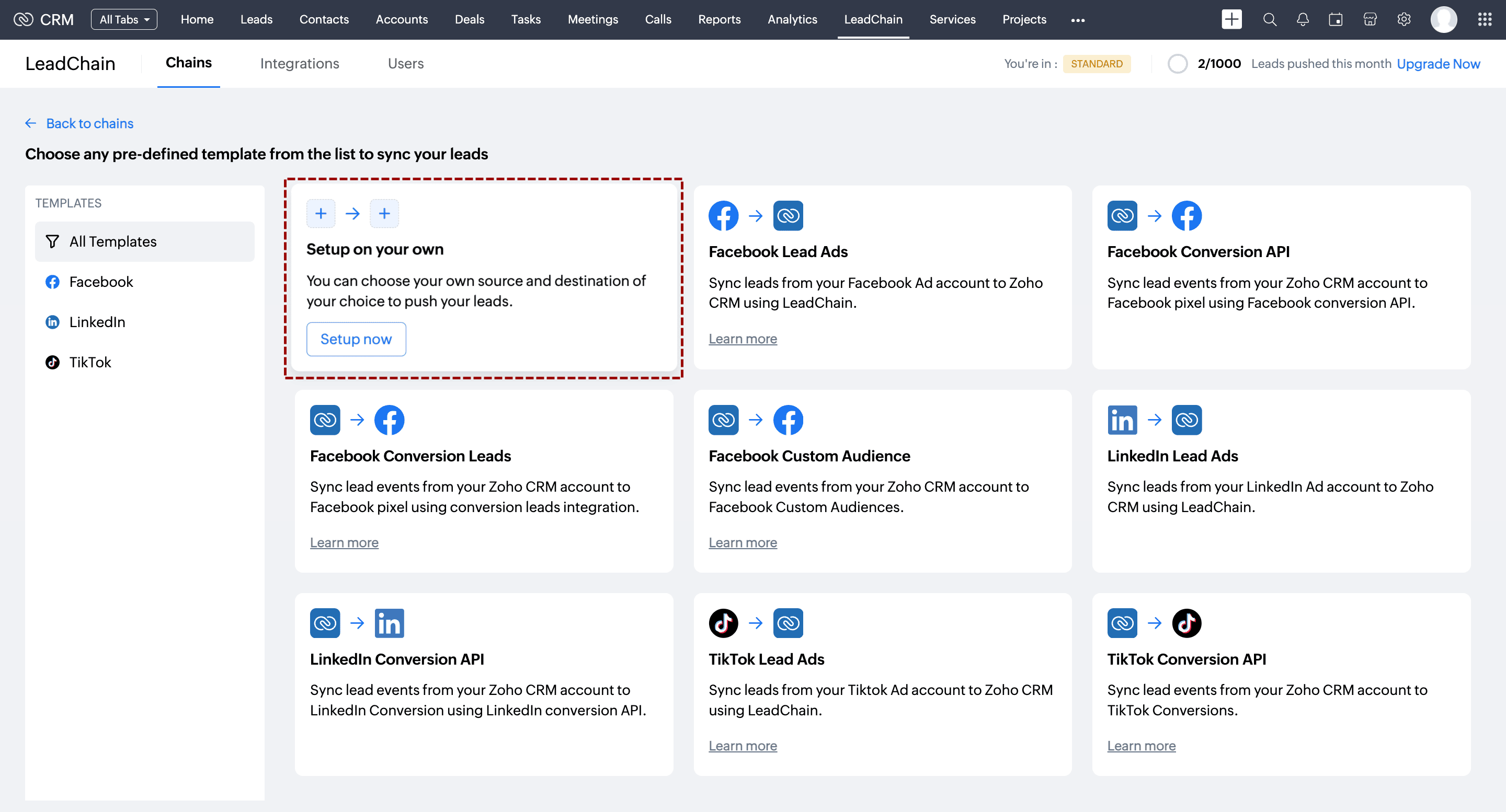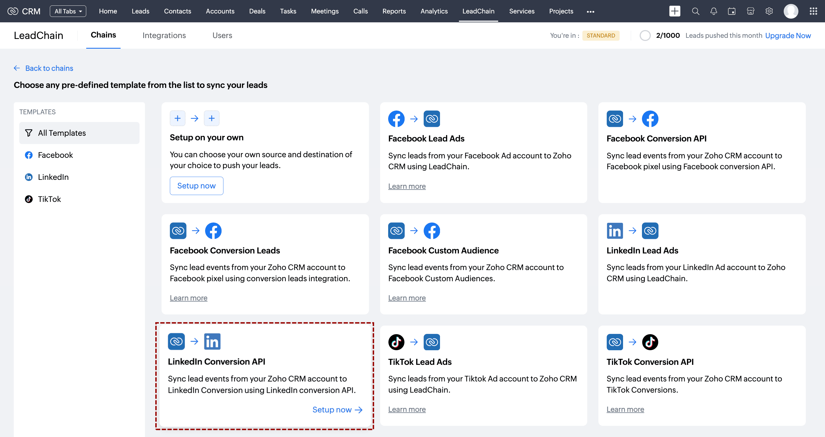 Zoho LeadChain を使用すると、Zoho CRM と LinkedIn Conversions API を連携し、見込み客、連絡先、商談タブからマーケティングデータを自動的に同期できます。手順は次のとおりです。
