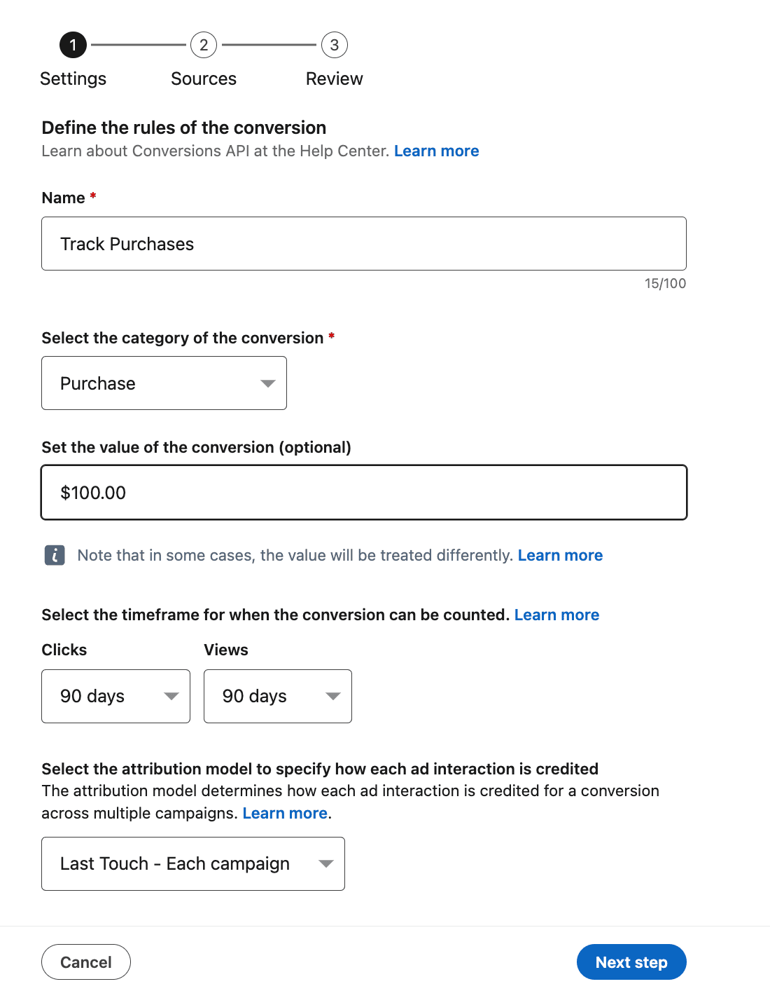 Conversion API を設定する際、どのアクションをコンバージョンとして扱うかを LinkedIn に理解させるために、コンバージョンルールの作成が不可欠です。無料トライアルへの登録、e ブックのダウンロード、カートへの商品追加、商品の購入など、内容はさまざまです。これには、LinkedIn 広告キャンペーンマネージャーで次の項目を設定します。