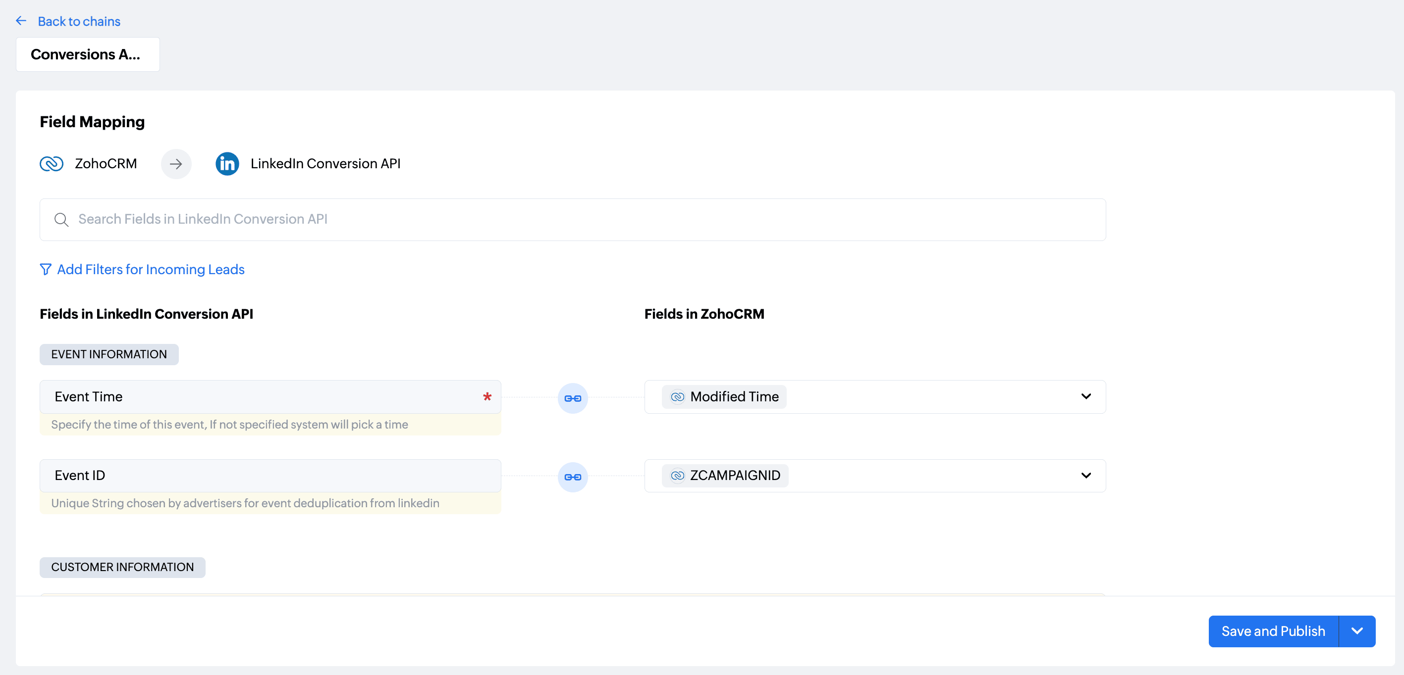 このステージでは、LinkedIn Conversions API と Zoho CRM 間の各項目をマッピングします。これにより、見込み客、連絡先、商談タブから LinkedIn に送信されるデータの内容が決まります。