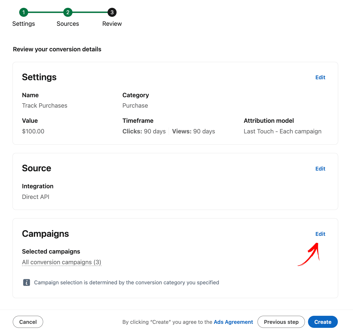 Review your conversion 詳細ページの Campaigns の横にある Edit をクリックします。