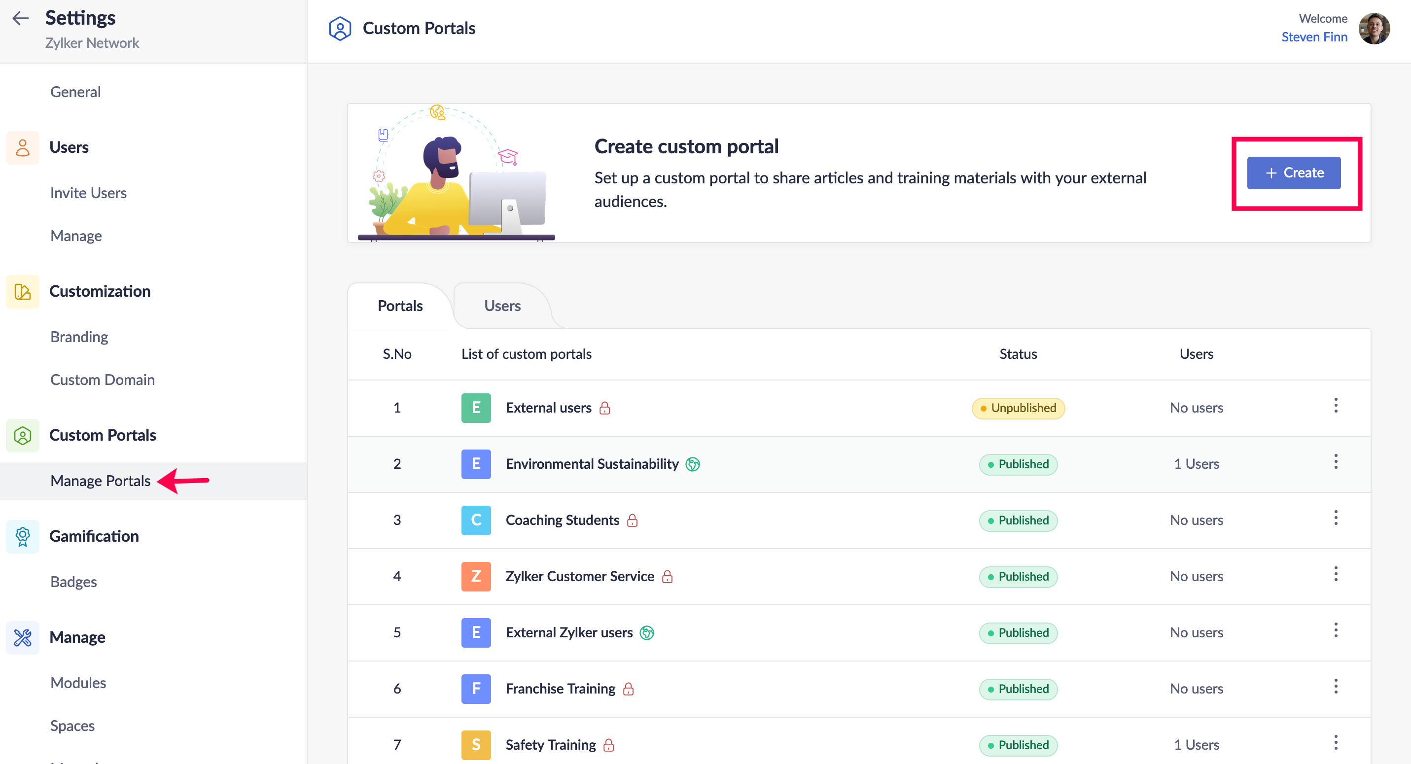 1. カスタム ポータルタブ内の管理 Portalsからポータルに移動します。