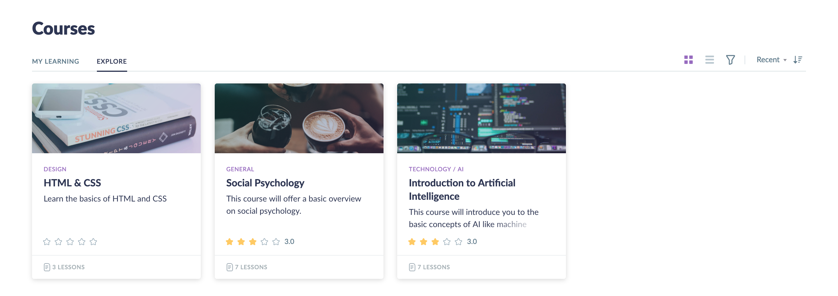 ハブ内で誰でも公開済みのコースは、exploreタブに表示されます。これらのコースは、ハブ内のすべての学習者が受講登録し、学習を開始することができます。管理者の承認が必要なコースの場合は、管理者が受講申請を承認した後に学習を開始できます。