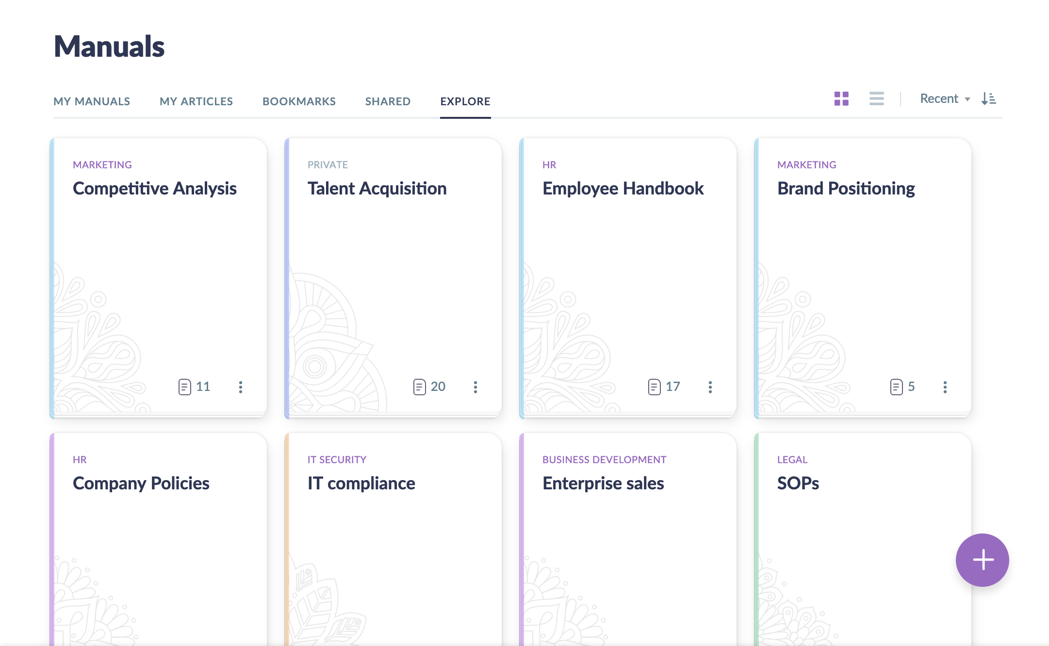 一部の情報は、組織内のすべてのチームに共通の場合があります。このような情報は公開マニュアルとして管理できます。公開マニュアルは、Exploreタブから利用できます。