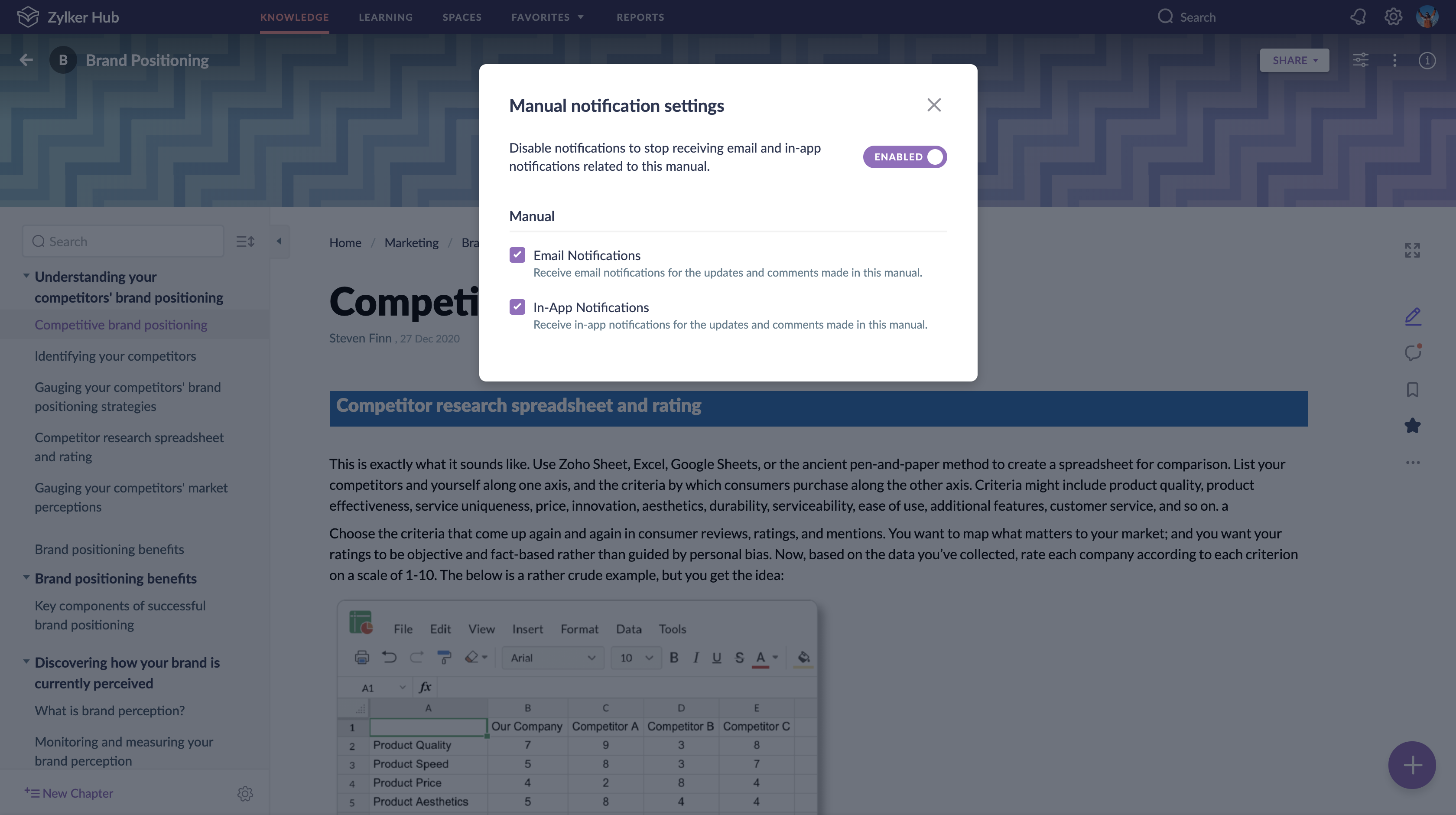 通知設定を利用して、特定のマニュアルに対するメールまたはアプリ内通知の受信を停止できます。マニュアルの通知は初期設定で有効になっています。
