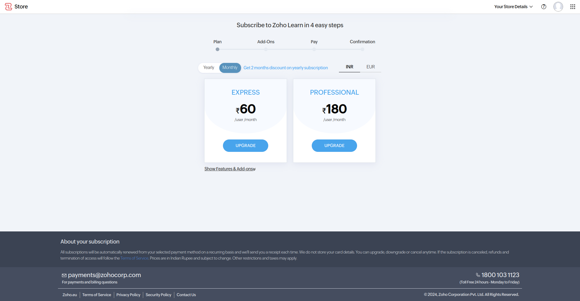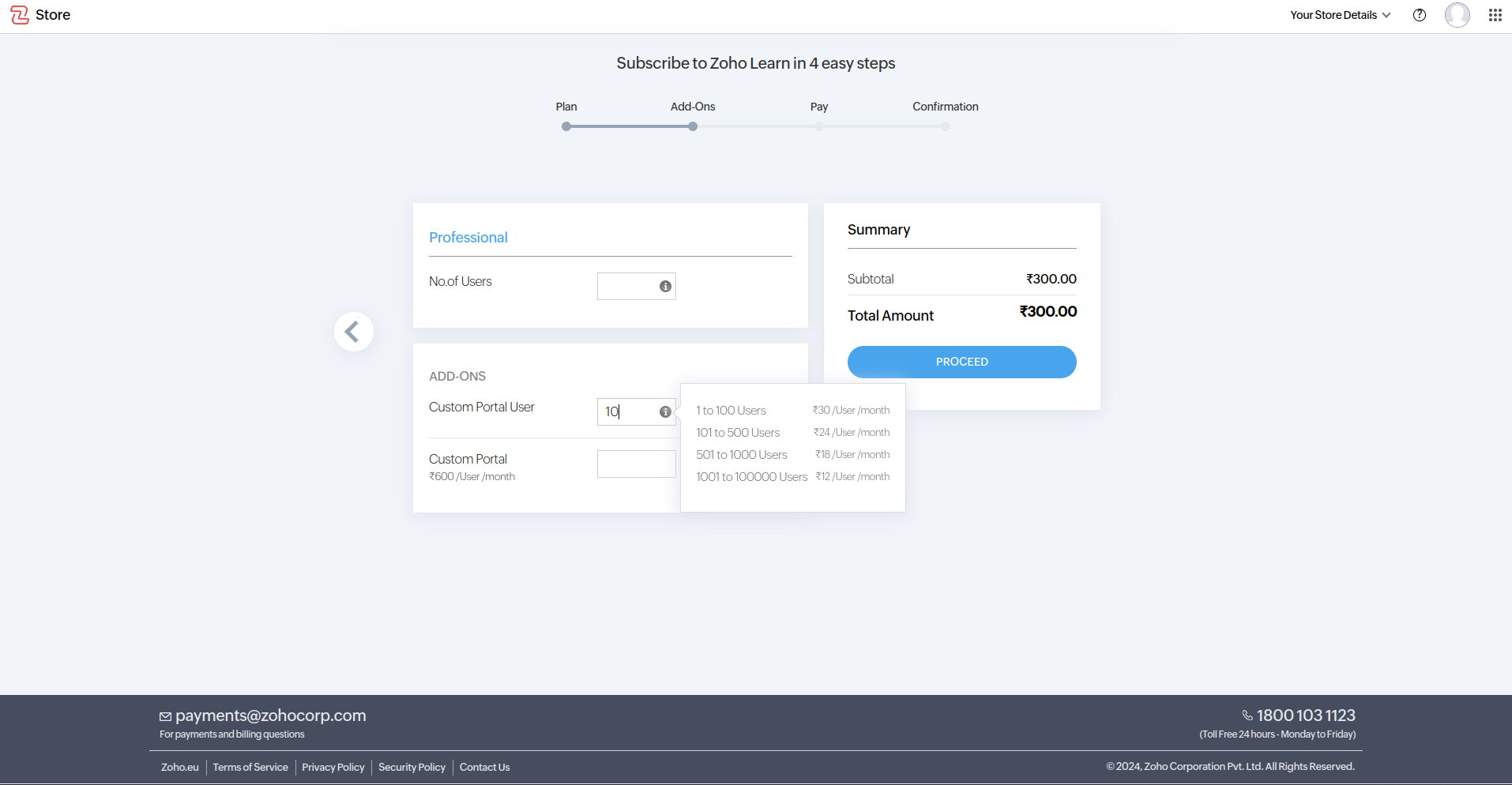 できることは、Zoho Learnの既存有料プランにカスタムポータルを追加オプションとして含めることです。ニーズに応じて、現在のプランで利用可能な範囲を超えて追加のユーザーやポータルを購入できます。カスタムポータルユーザーの数は、ハブに追加したポータルにのみ適用され、ハブ自体のユーザーには含まれません。