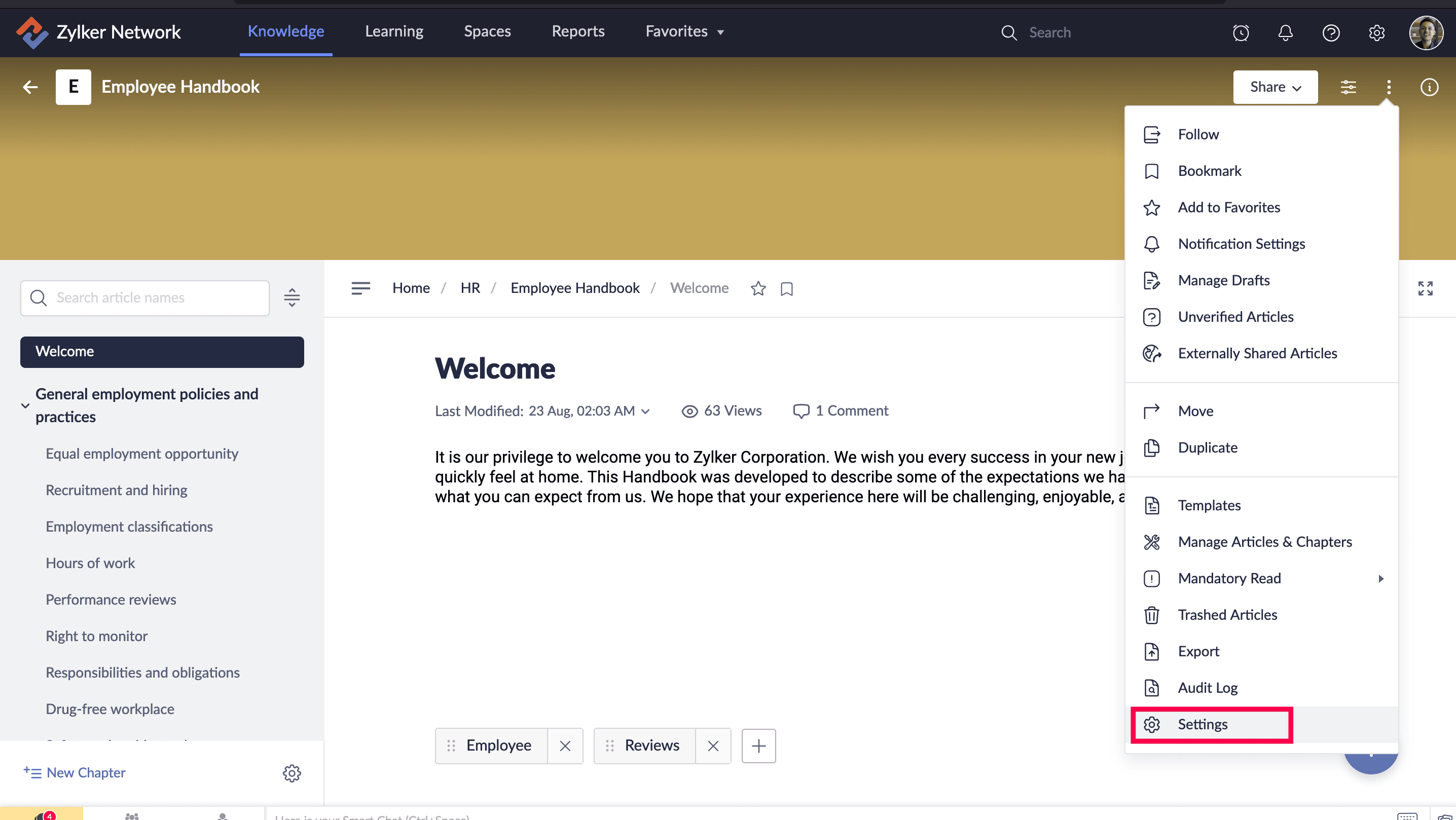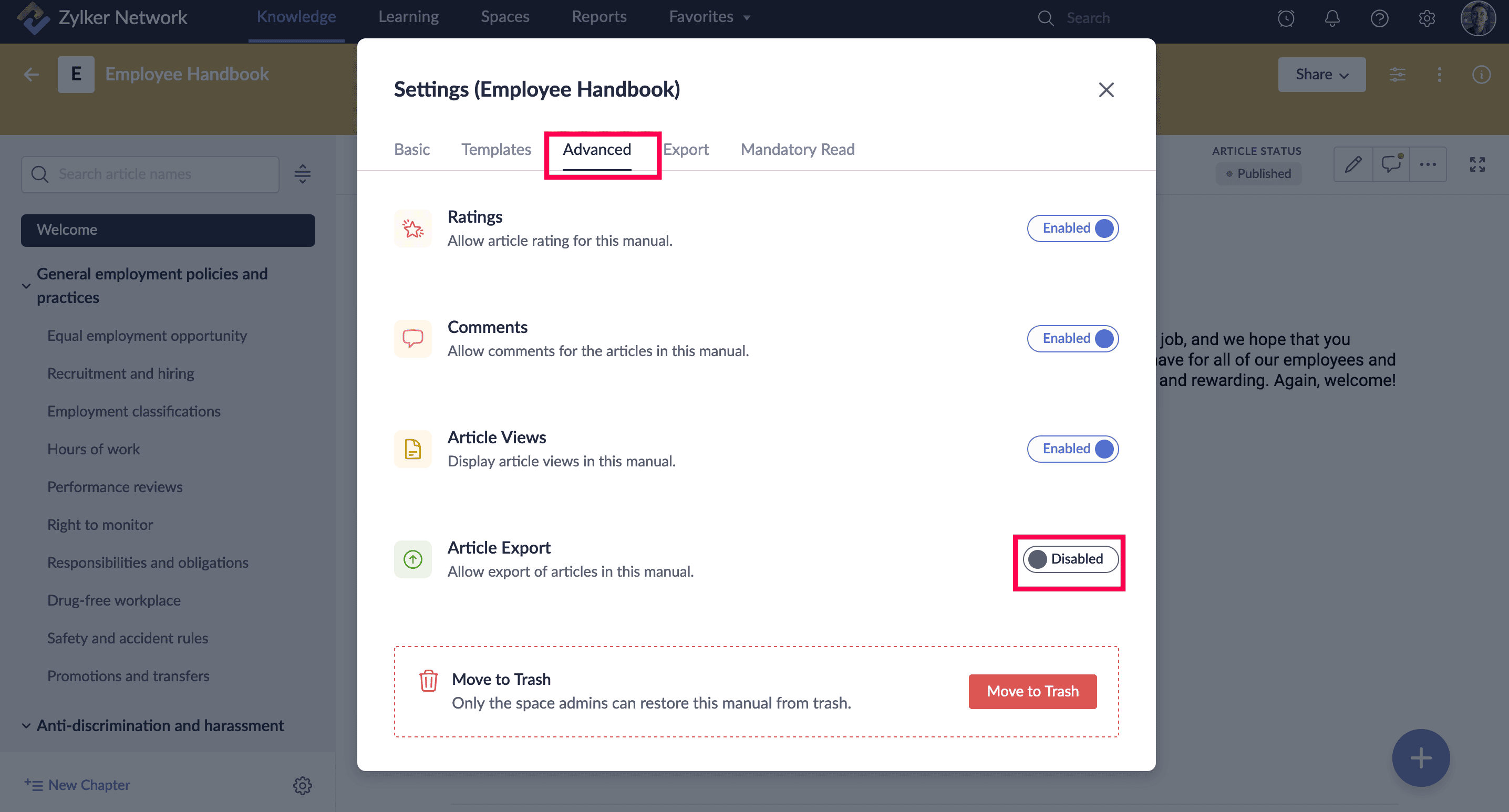 詳細をクリックし、次に有効にするまたは無効にする article エクスポートするを選択します。