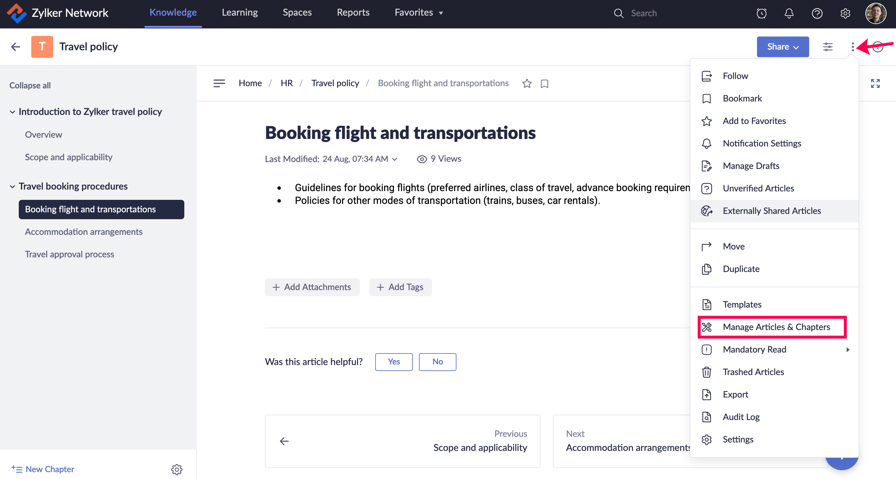 Manual 設定 () アイコンをクリックし、管理 Article & Chapters をクリックします。