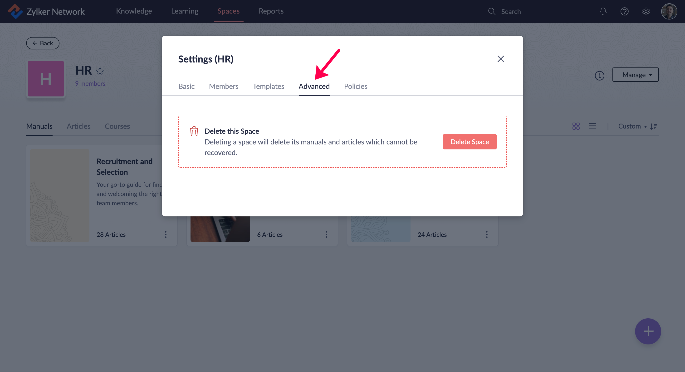 一度スペースを削除すると、すべてのマニュアル、記事、コースが完全に削除されます。