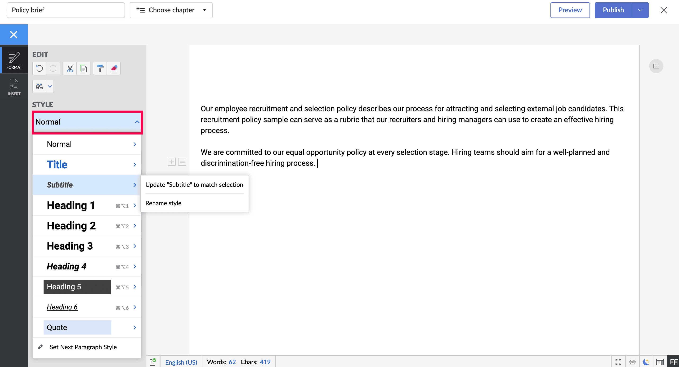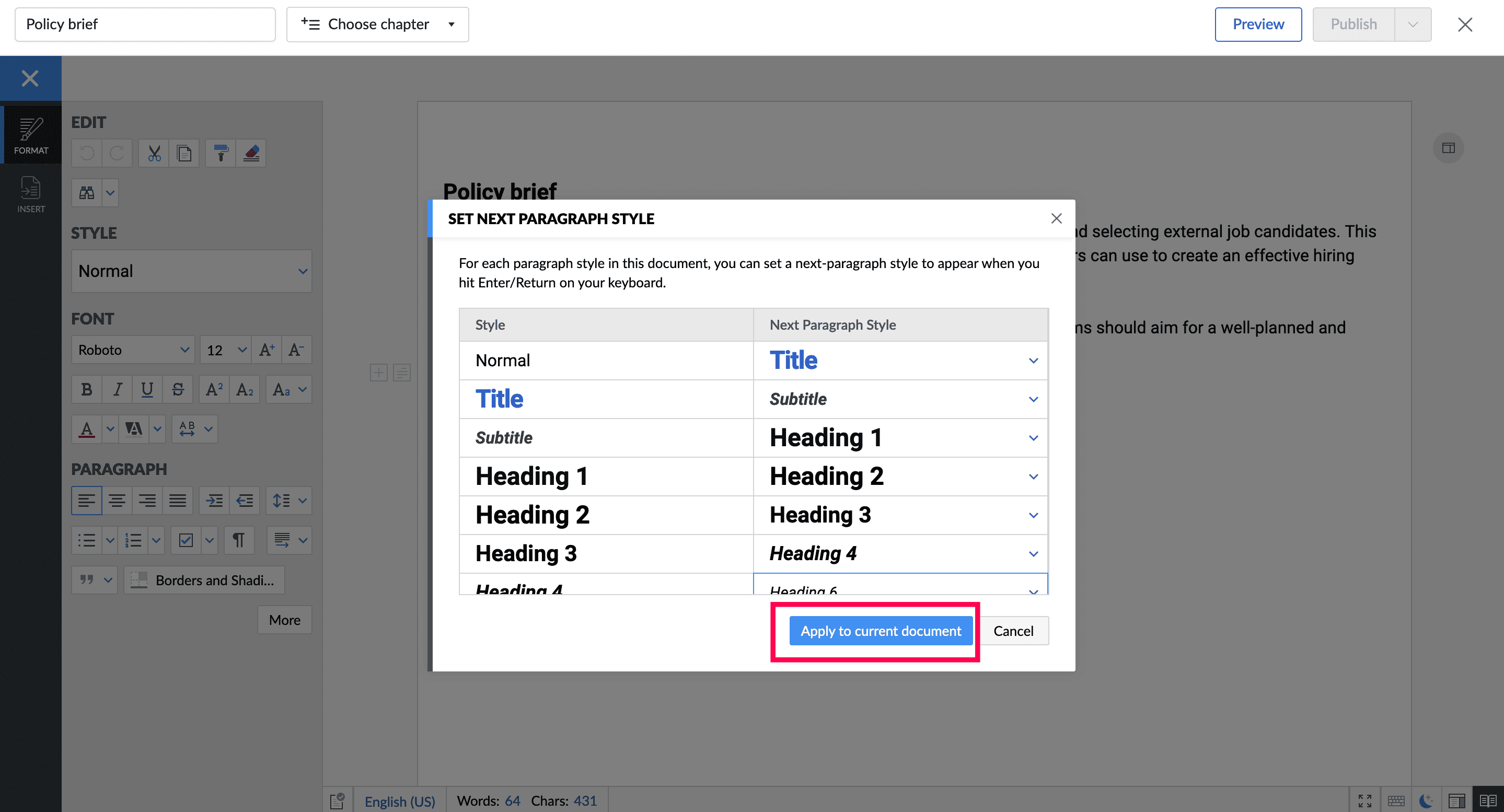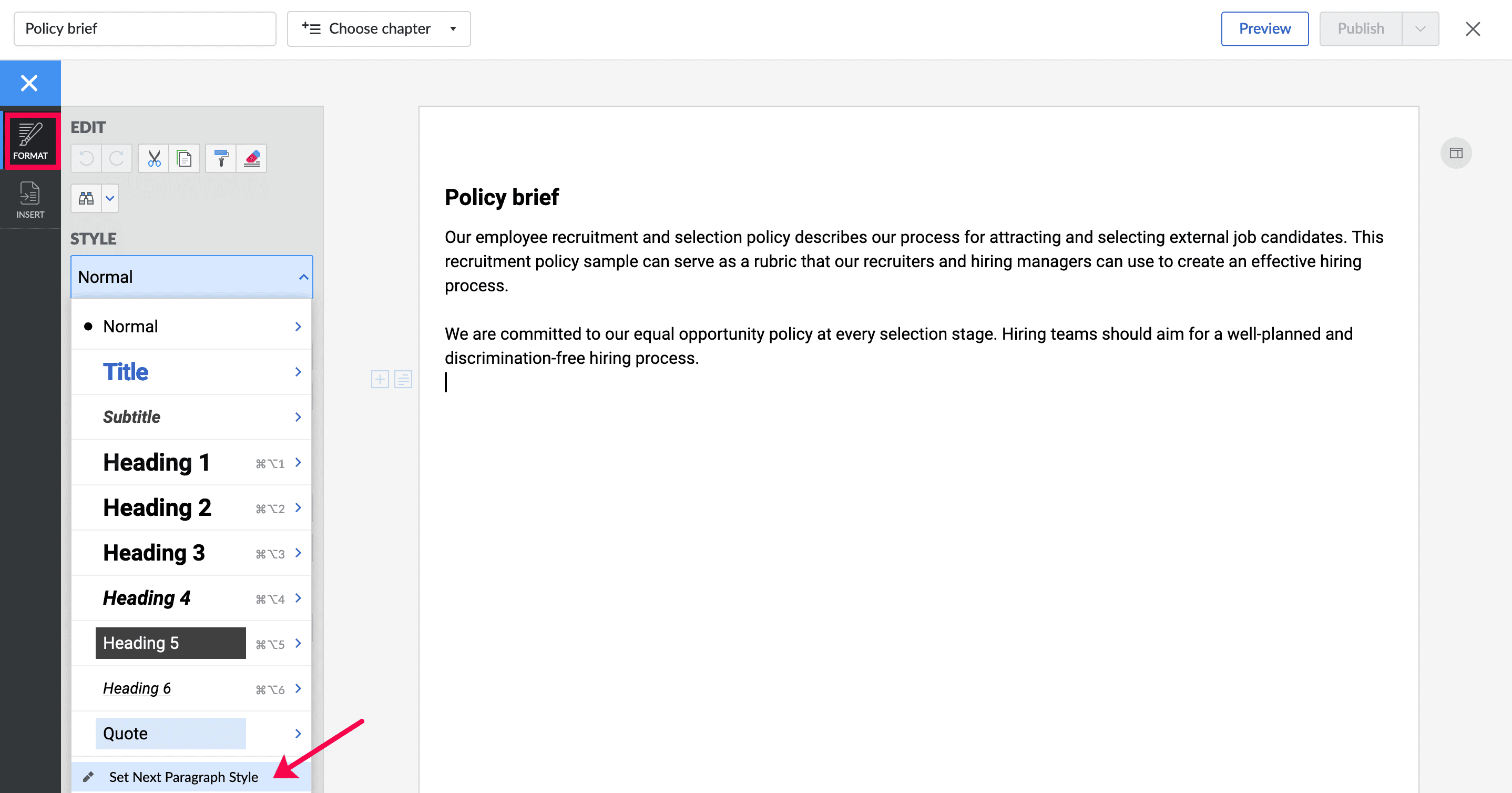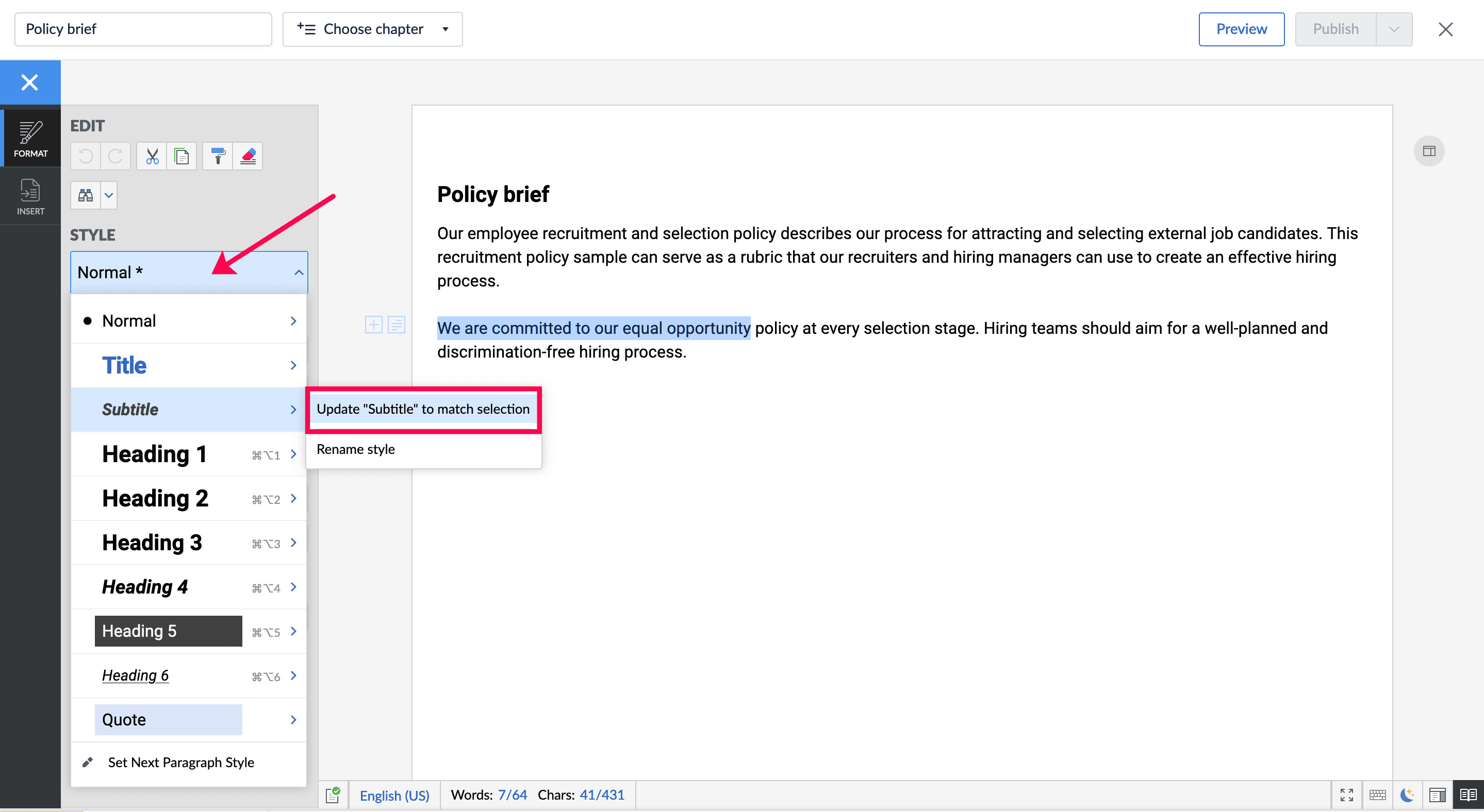 更新されたスタイルはプレビューでハイライト表示されます。更新したいスタイルの横にある矢印をクリックします。