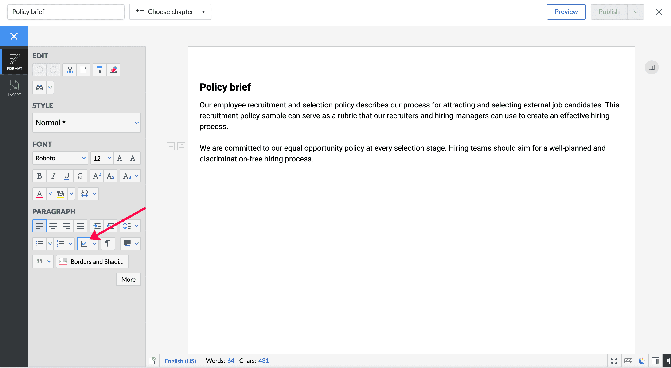 形式タブのParagraph内で、Check Listアイコンの横にある下向き矢印をクリックします。