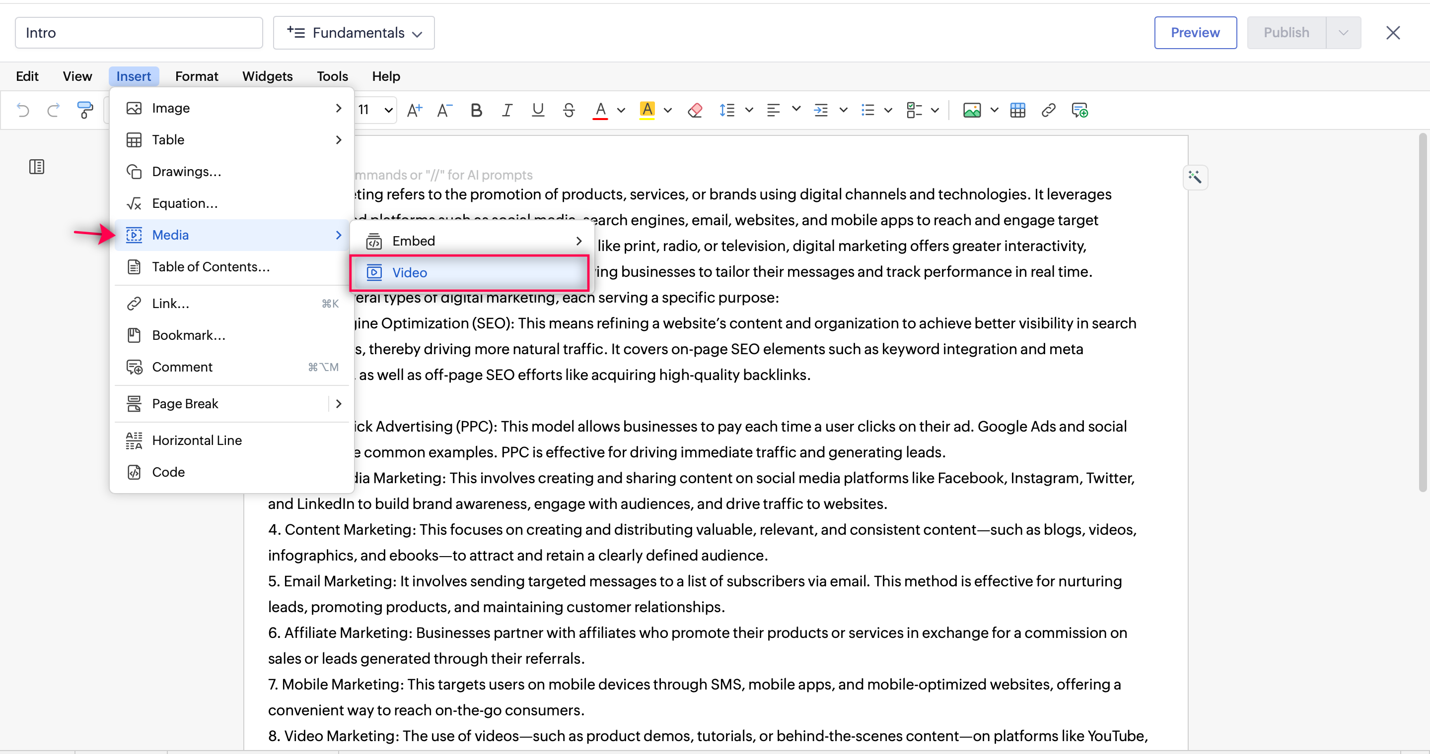 1.Insert を選択し、Media をクリックします。