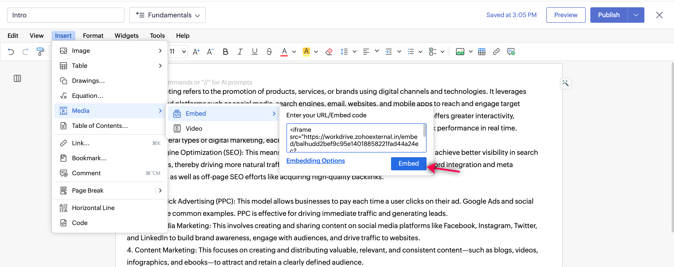 6. WorkDrive からコピーした埋め込みコードを貼り付け、Embed をクリックします。