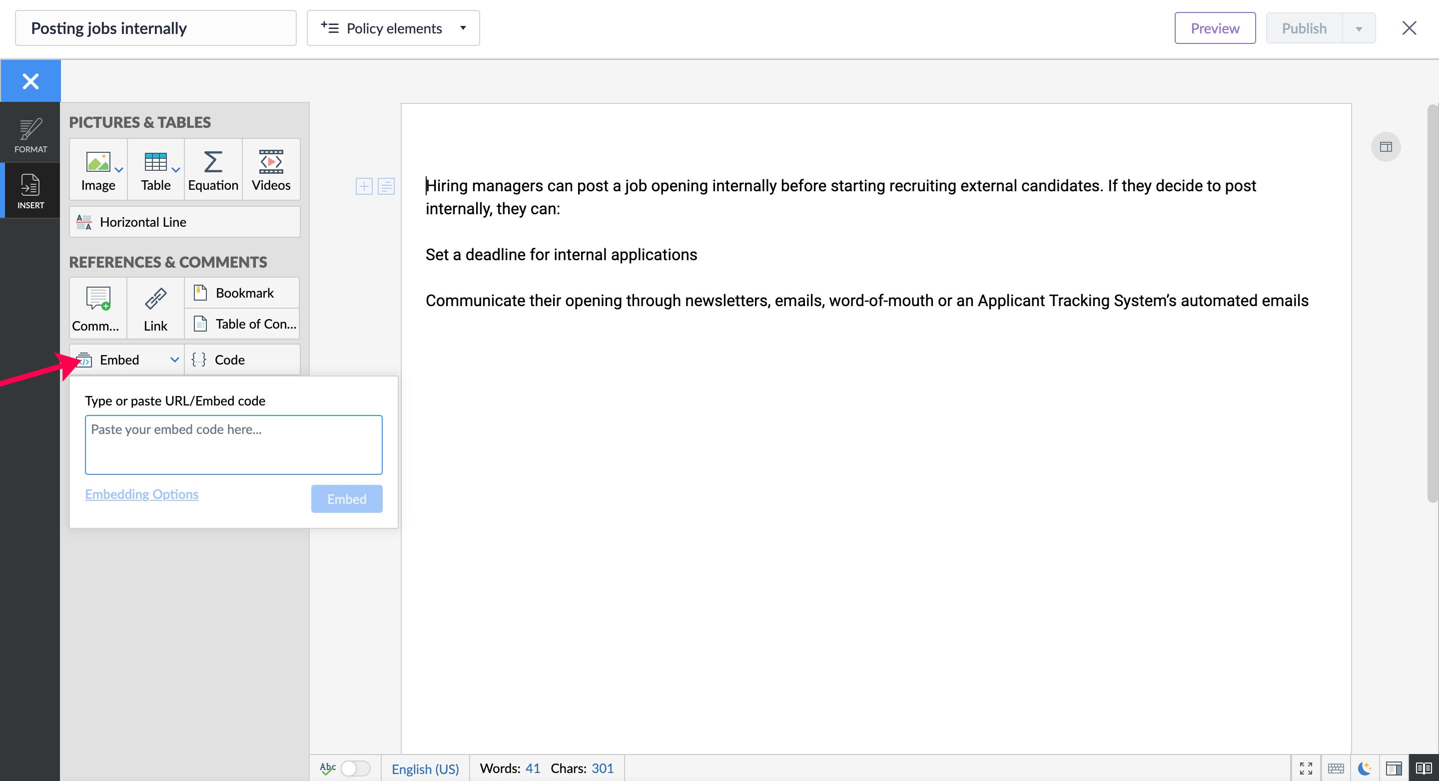 Zoho Learnのembedコード機能を利用すると、マルチメディア、インタラクティブな要素、ソーシャルメディア投稿、フォーム、その他の外部コンテンツを、さまざまなウェブサイトやサードパーティのソースから記事内に組み込むことができます。外部データ元からコードをコピーし、作成時に挿入することで、記事内にその要素を表示できます。