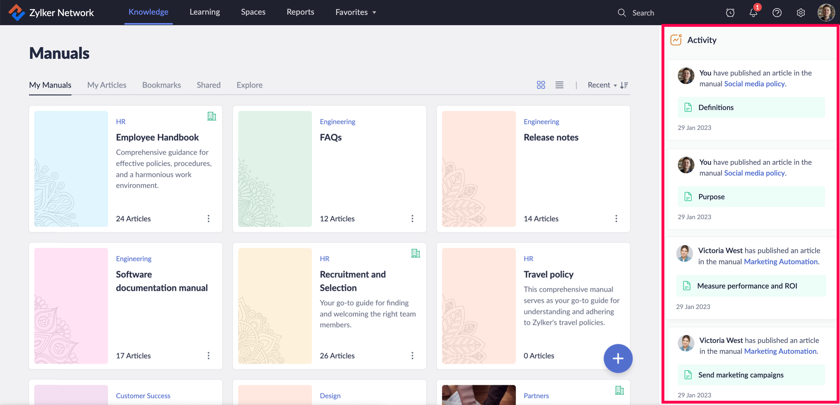 1. Knowledgeタブに移動します。画面右側に活動タブが表示されます。