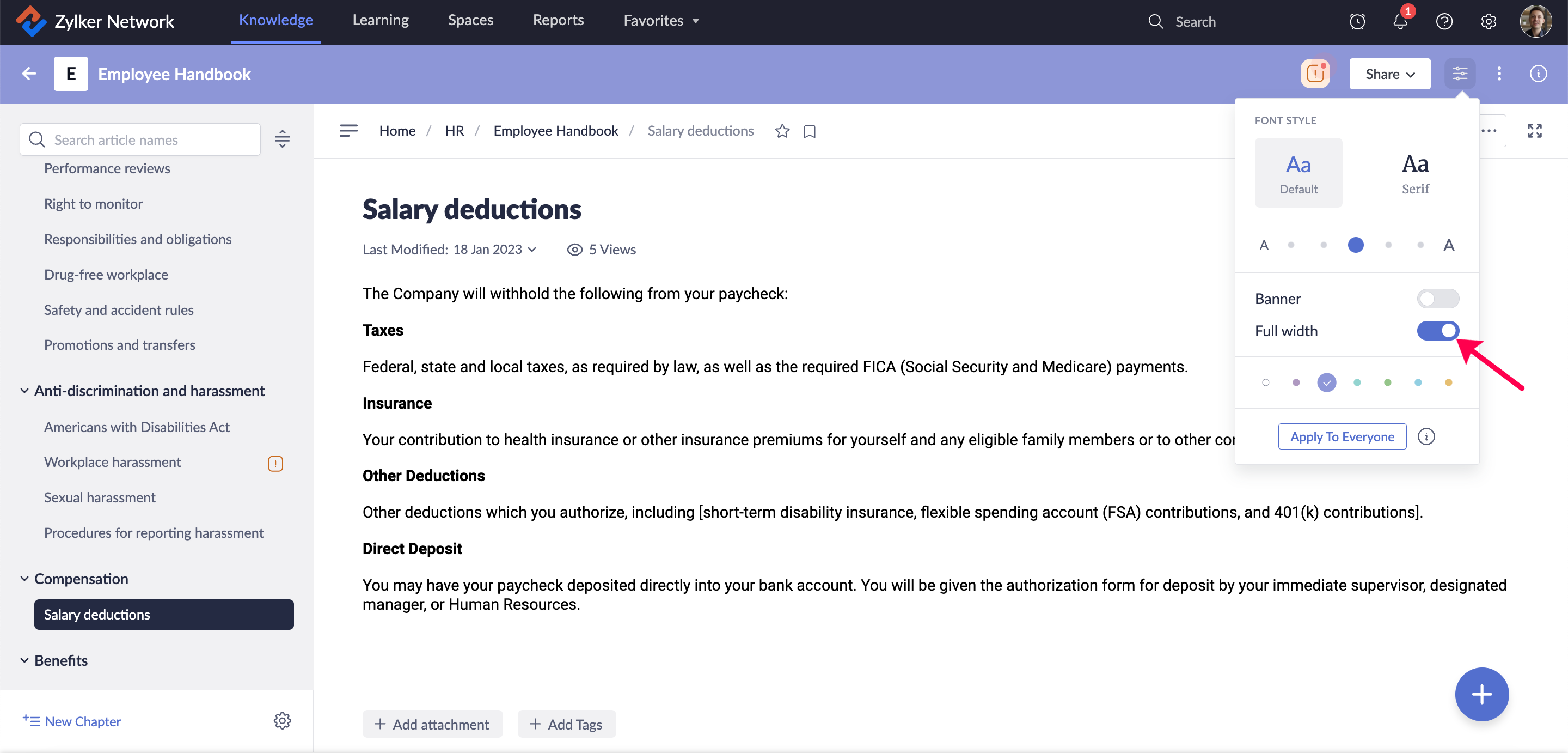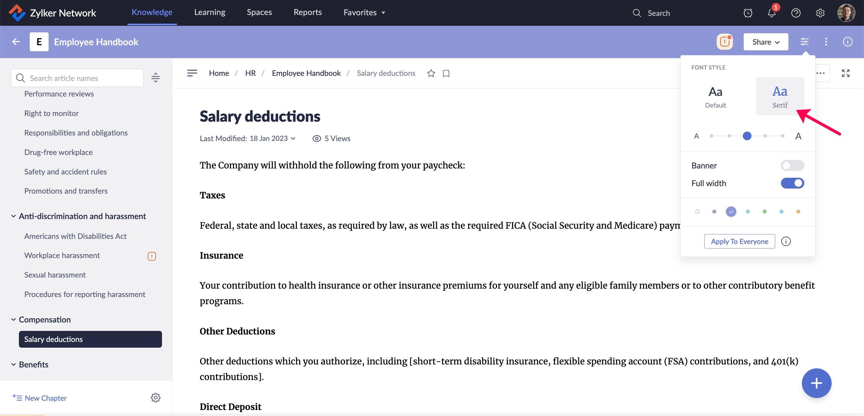 これらの変更はエディター内のコンテンツには適用されません。フォントのスタイル各種設定は個人のリーダー表示のみで利用可能です。