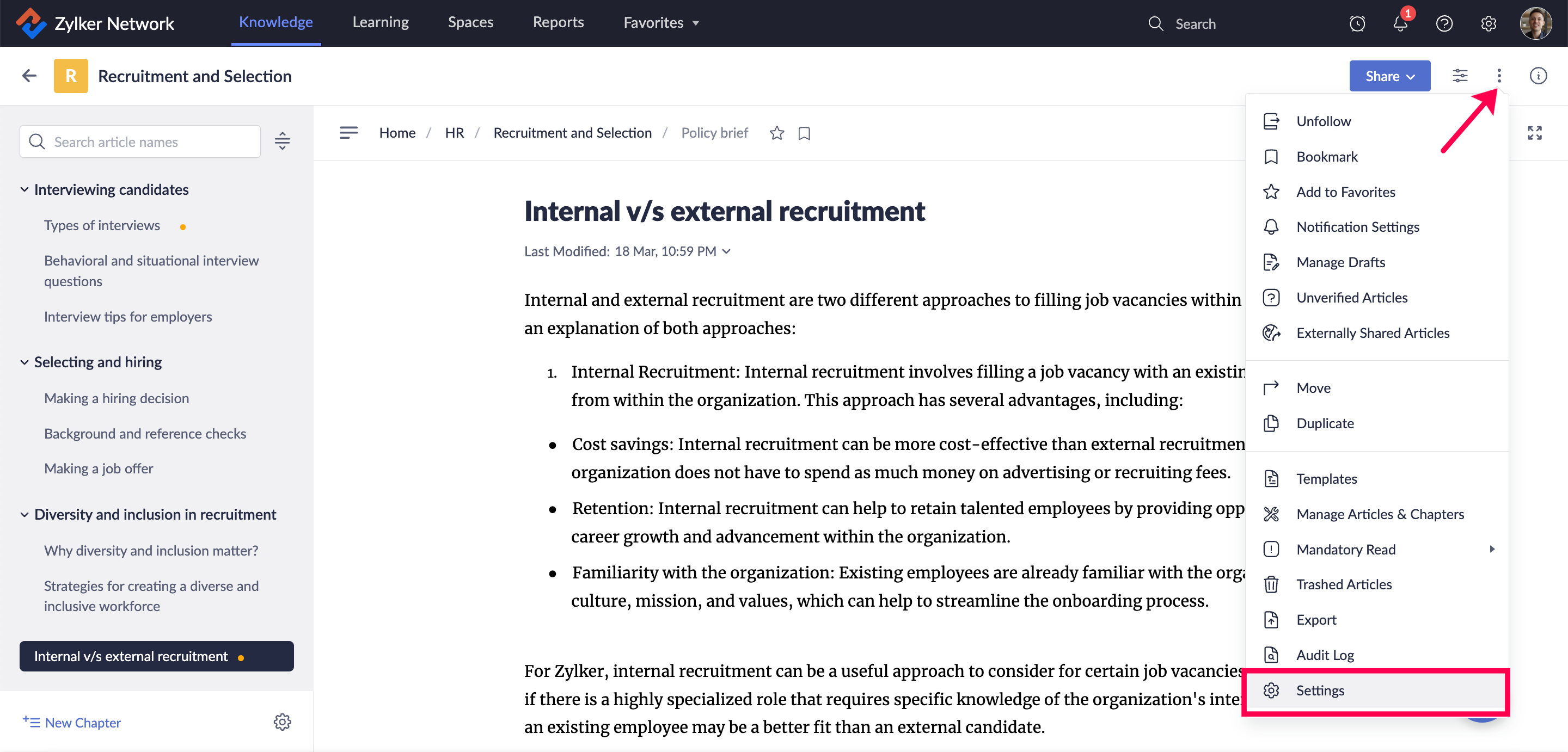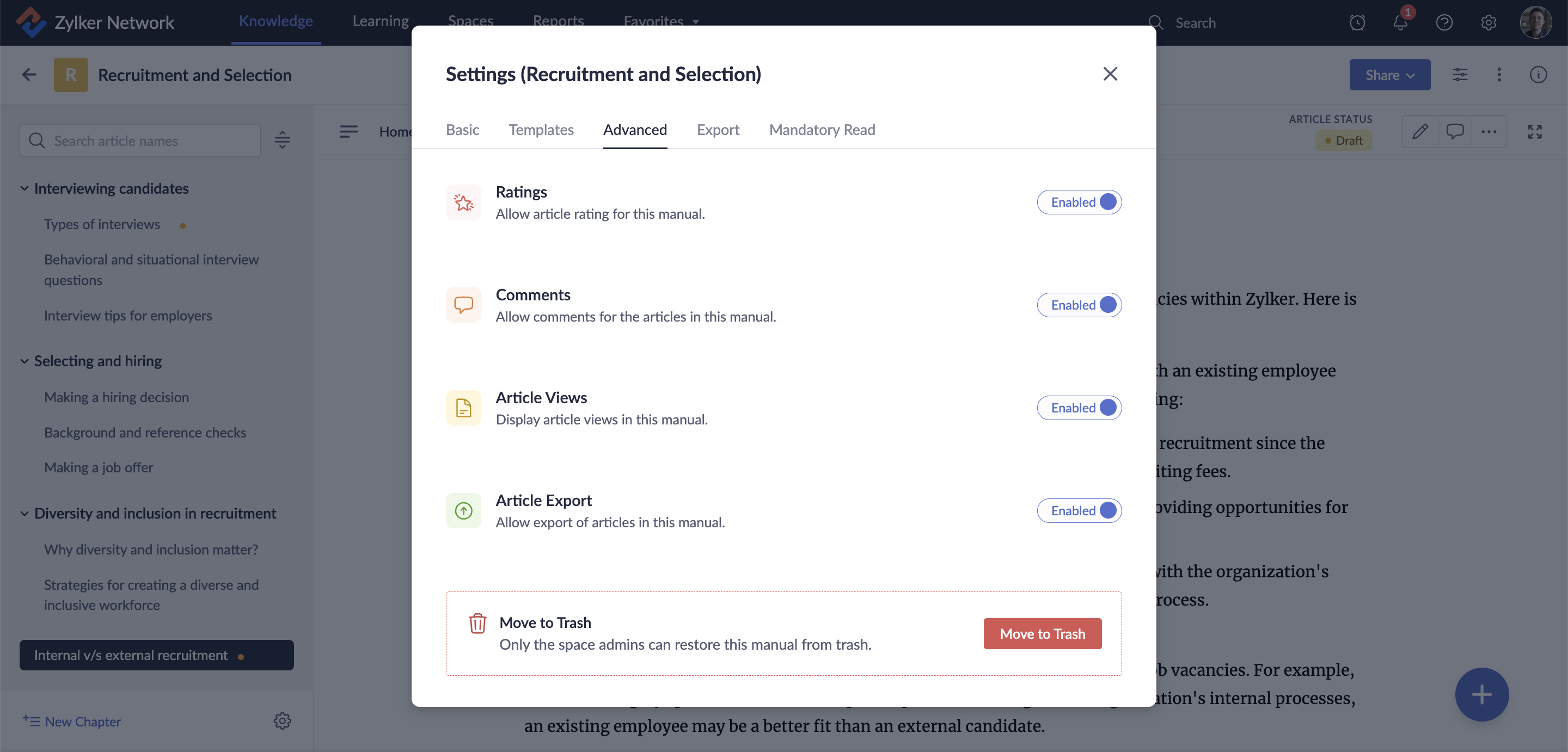 マニュアルまたはそのマニュアルが属するスペースの管理者は、記事に対してratings、コメント、エクスポート、表示回数を有効化または無効化できます。