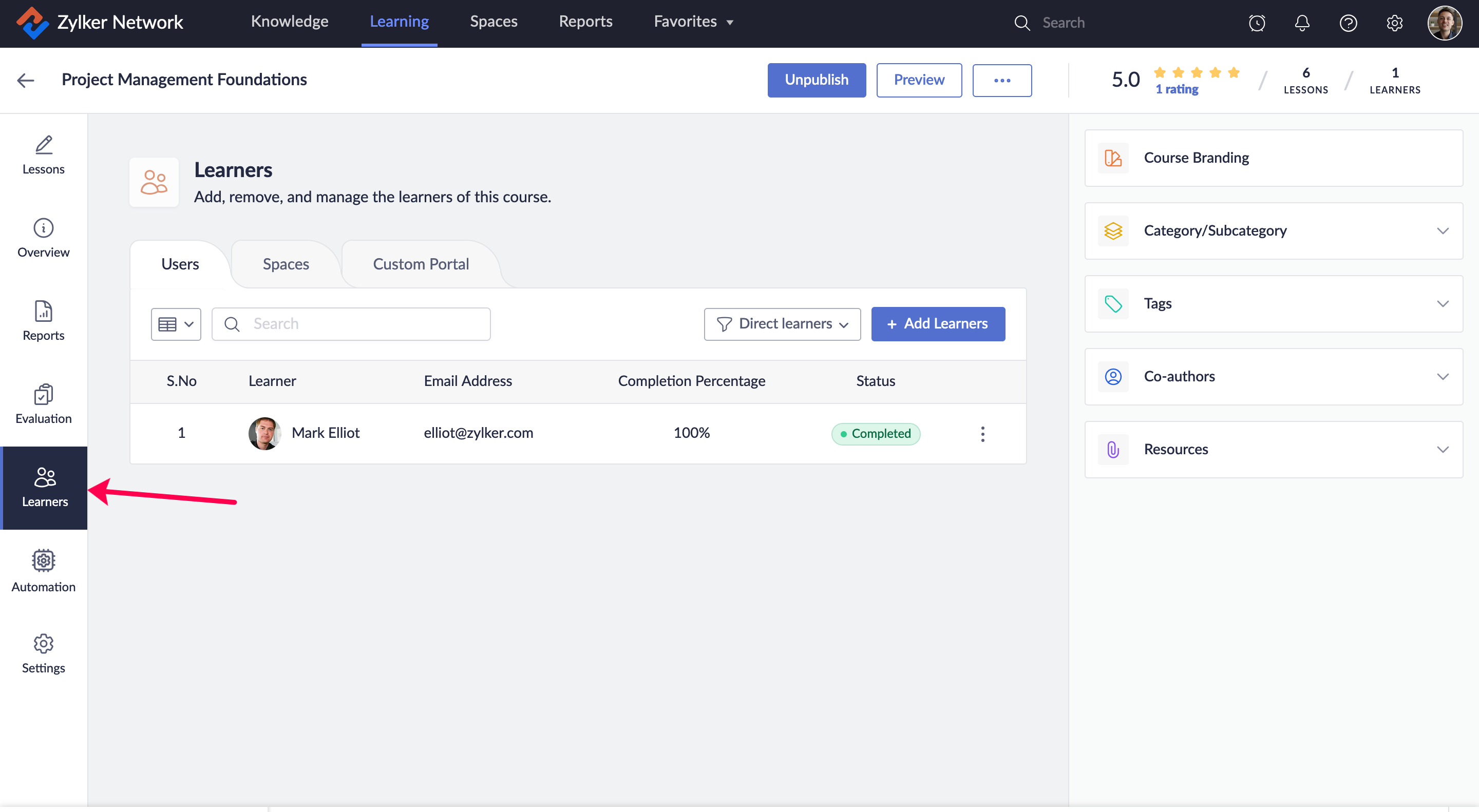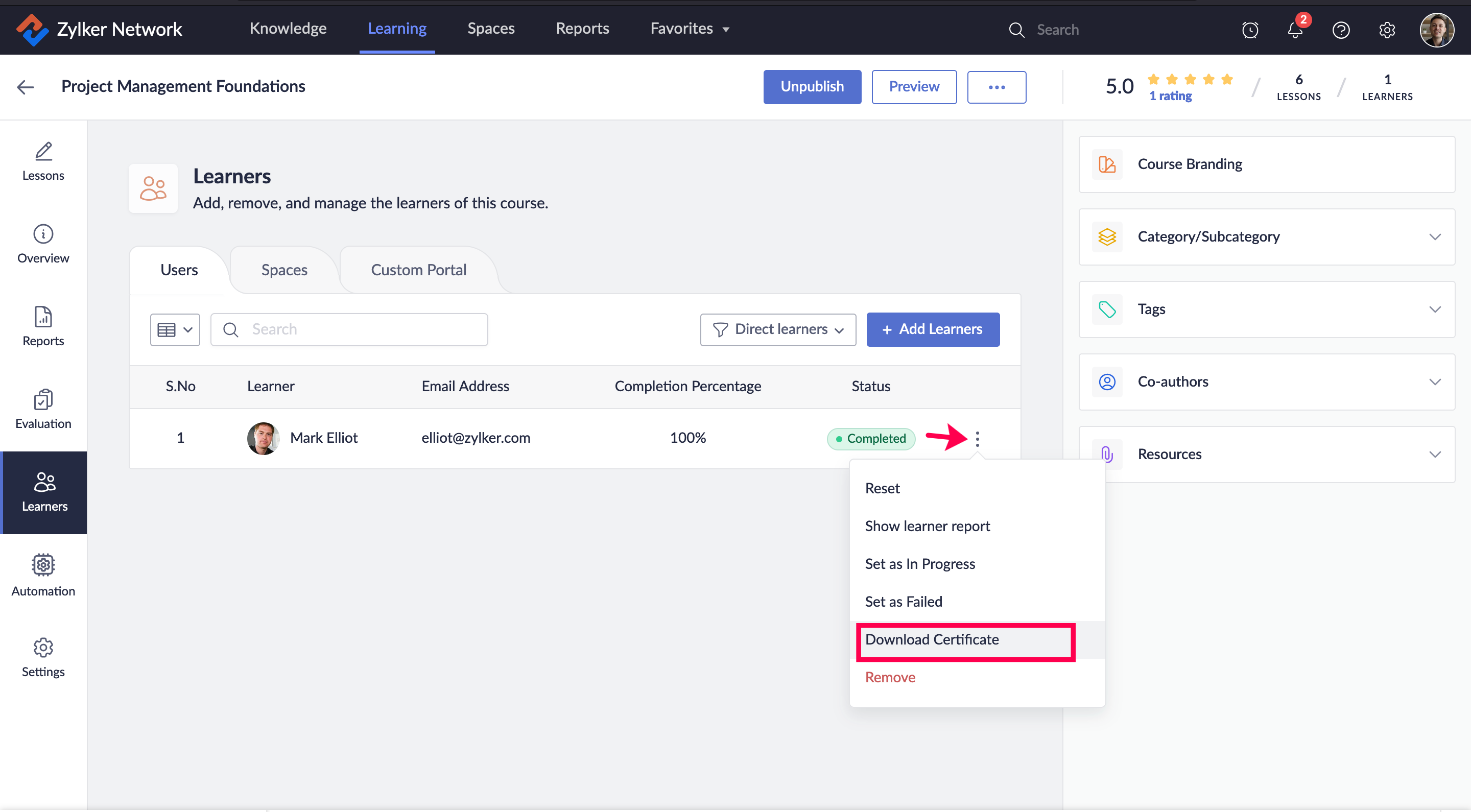 コース管理者は、個人学習者の修了証明書をダウンロードすることができます。学習者の証明書をダウンロードすることで、監査やレポート作成に必要な公式な認定データを管理者が保持できます。また、学習者の進捗状況の評価や、コースが担当者によって完了しているかの確認にも役立ちます。