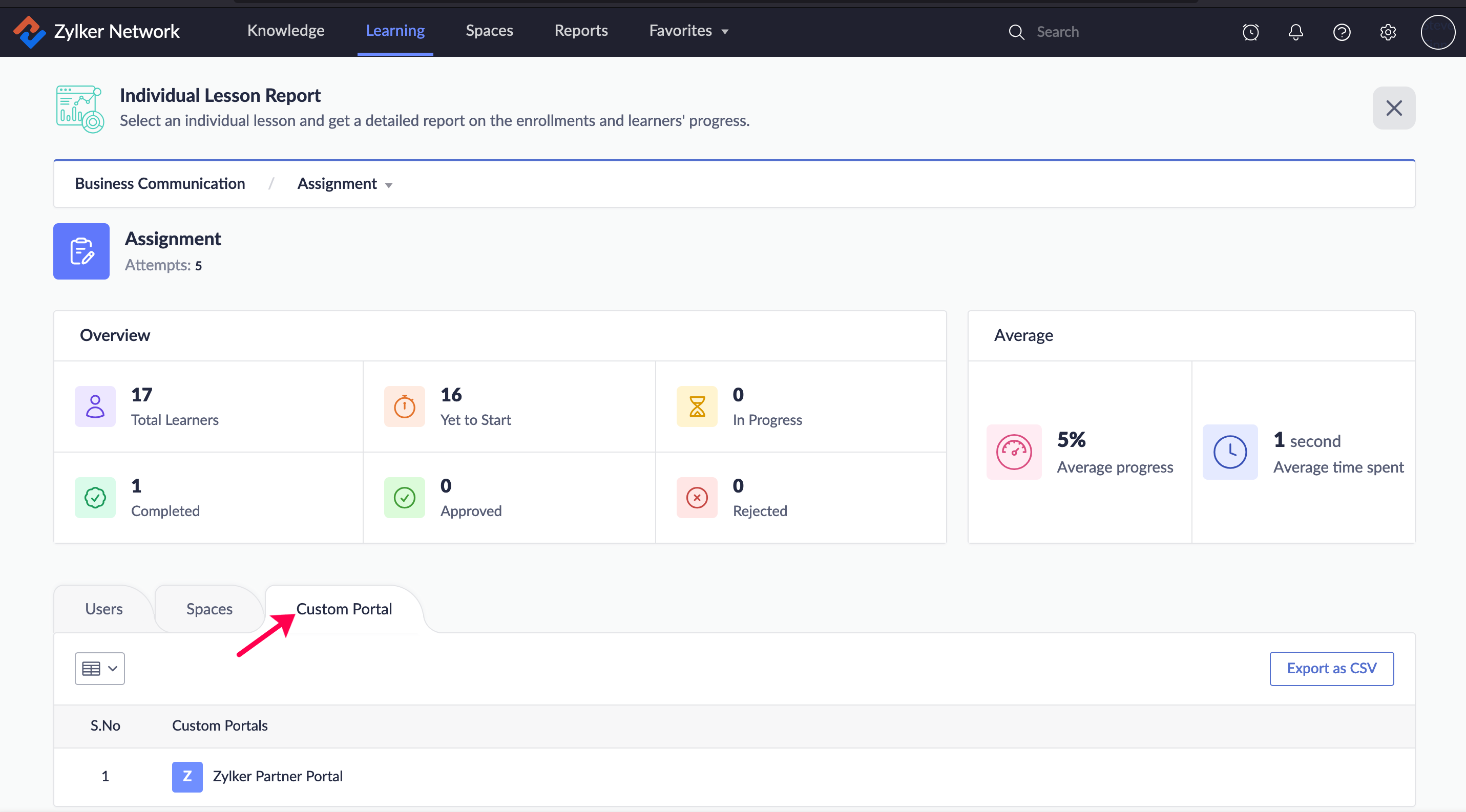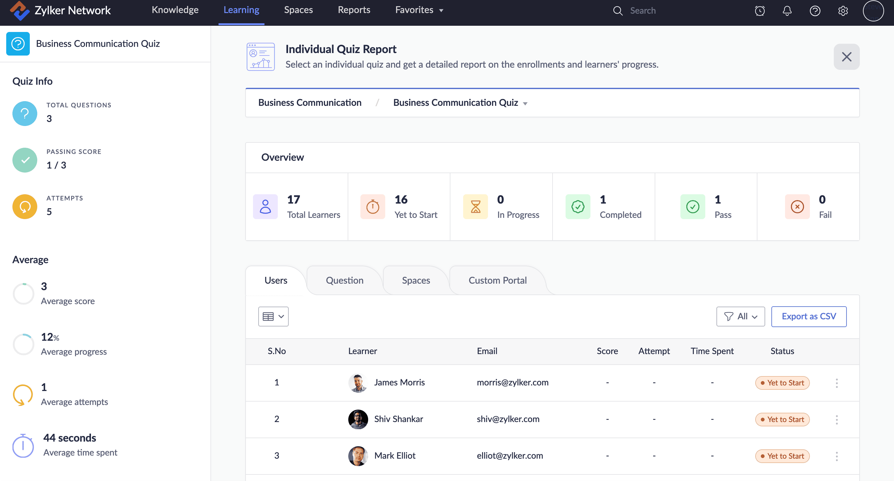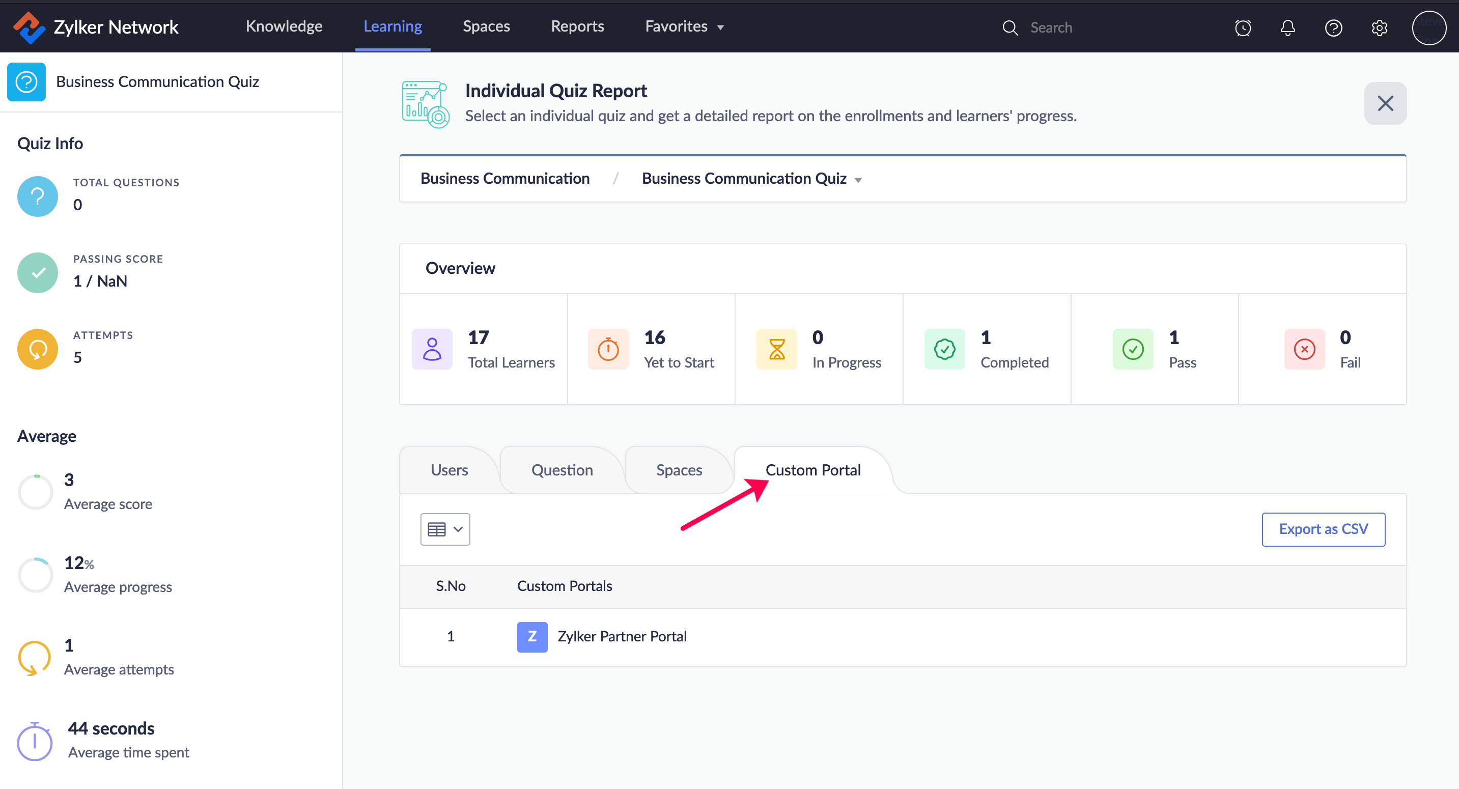 各カスタムポータルの詳細なレポートを表示できます。これにより、異なるポータルごとにクイズレポートを個別に分析できます。スペースの一覧、カスタムポータルの合計一覧、学習者のステータスを確認できます。特定のポータルを選択すると、そのクイズのユーザーごとのパフォーマンスレポートが表示されます。