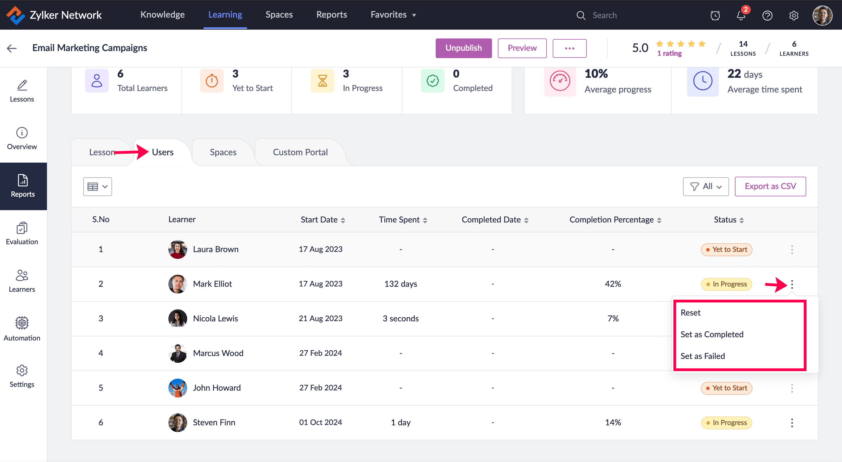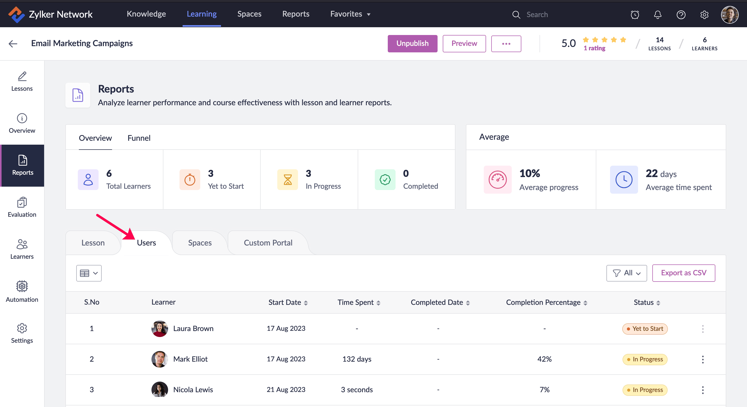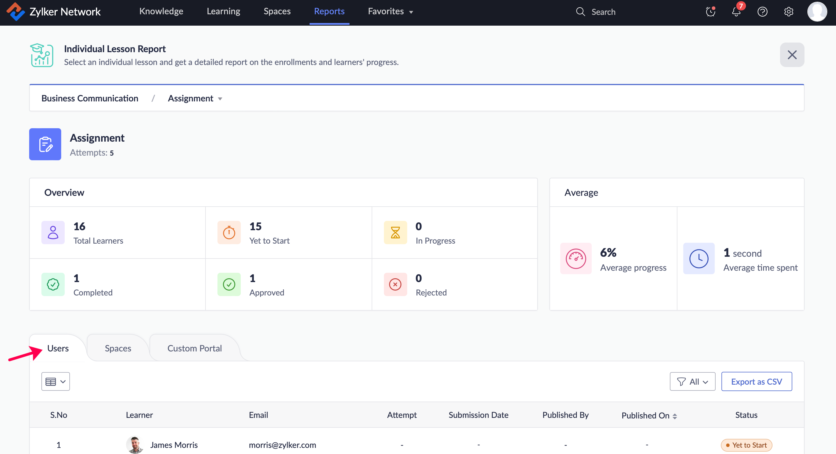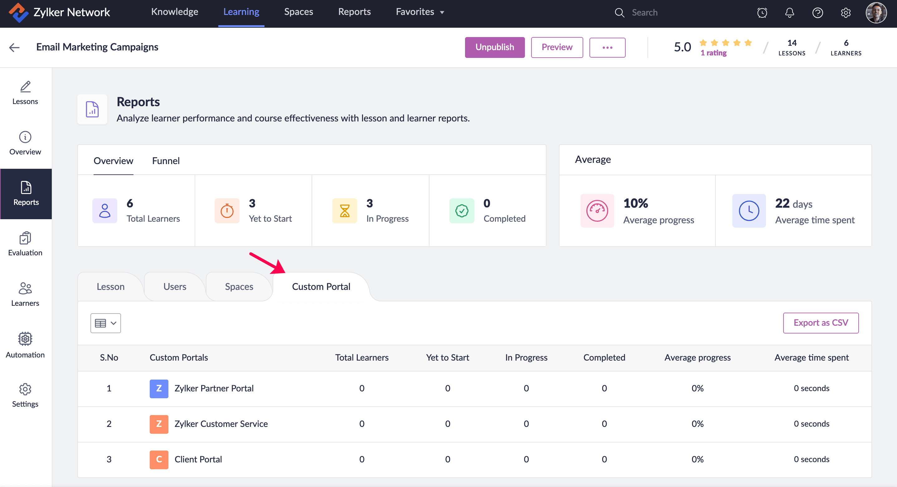 各カスタムポータルの詳細なレポートを表示できます。これにより、異なるポータルごとにクイズレポートを個別に分析できます。スペースの一覧、カスタムポータルの合計一覧、学習者のステータスを確認できます。特定のポータルを選択すると、そのクイズのユーザーごとのパフォーマンスレポートが表示されます。