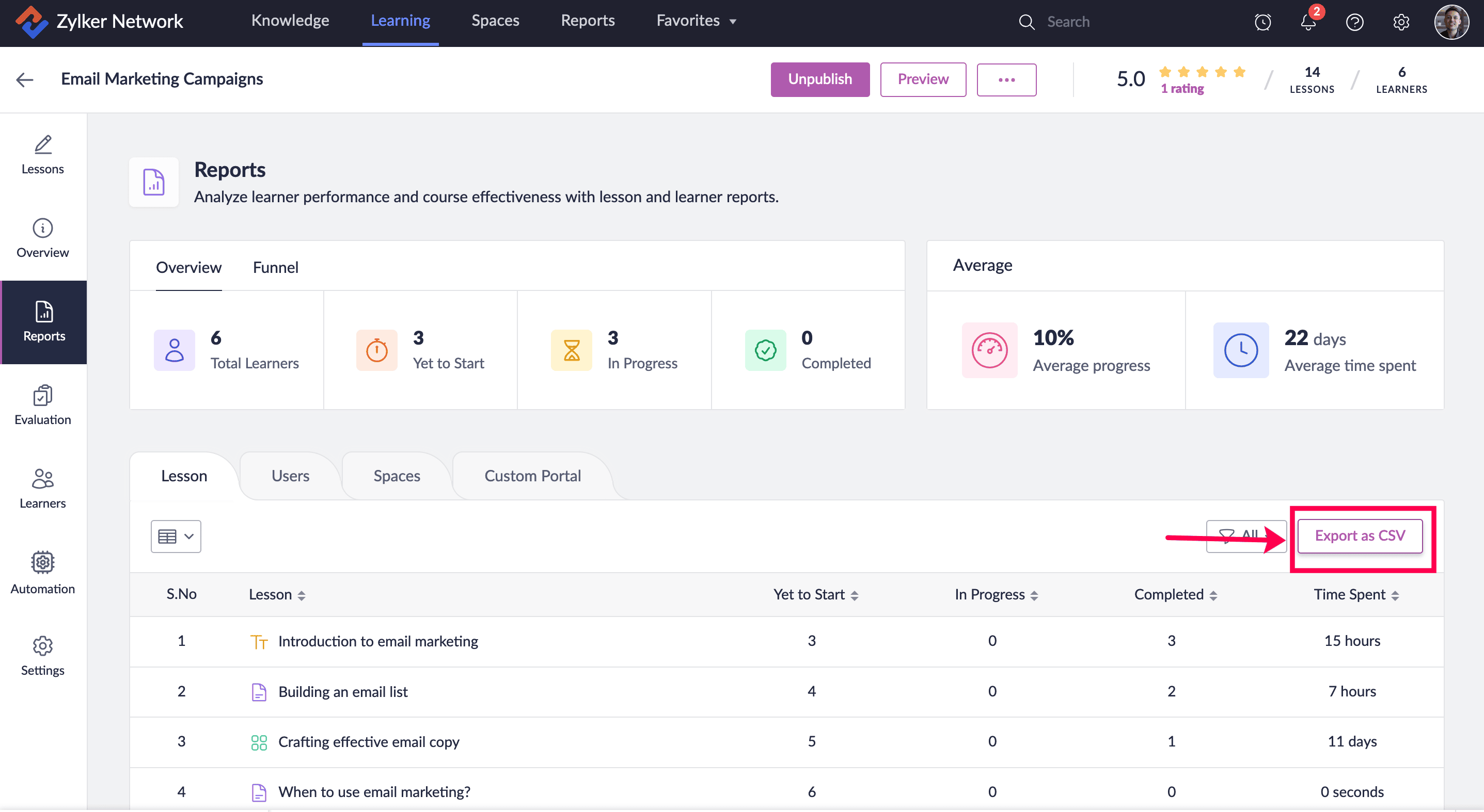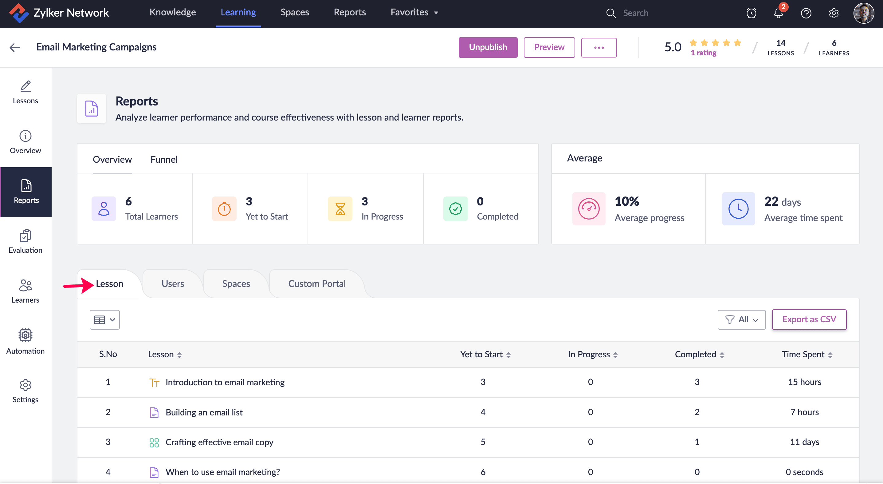 参照では、コース内で学習者の進捗やパフォーマンスを分析するために必要なすべての情報を提供します。各コースのレッスン、クイズ、課題、学習者の詳細は、コースレポートページで確認できます。