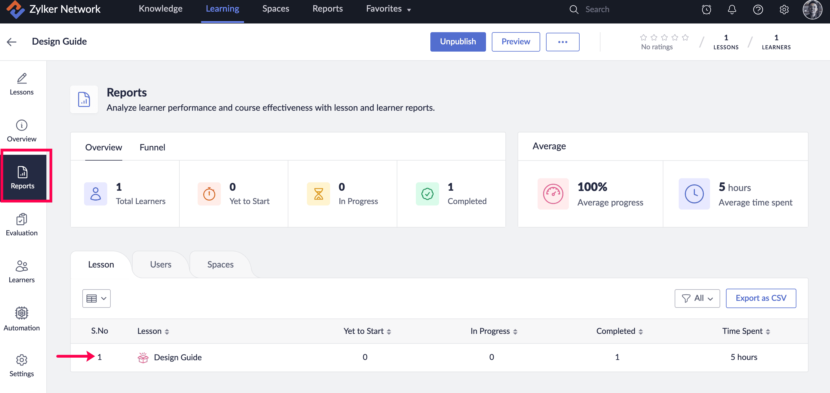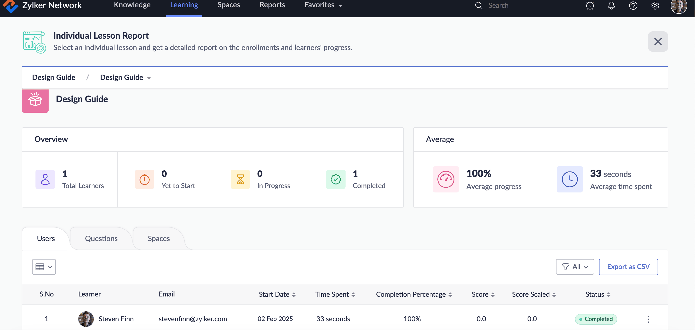 SCORMレッスンレポートは、学習者のSCORMレッスンでの進捗に基づいて作成されます。コースを受講した学習者の完了ステータスは、コースレポートセクションからSCORMレッスンをクリックすることで確認できます。