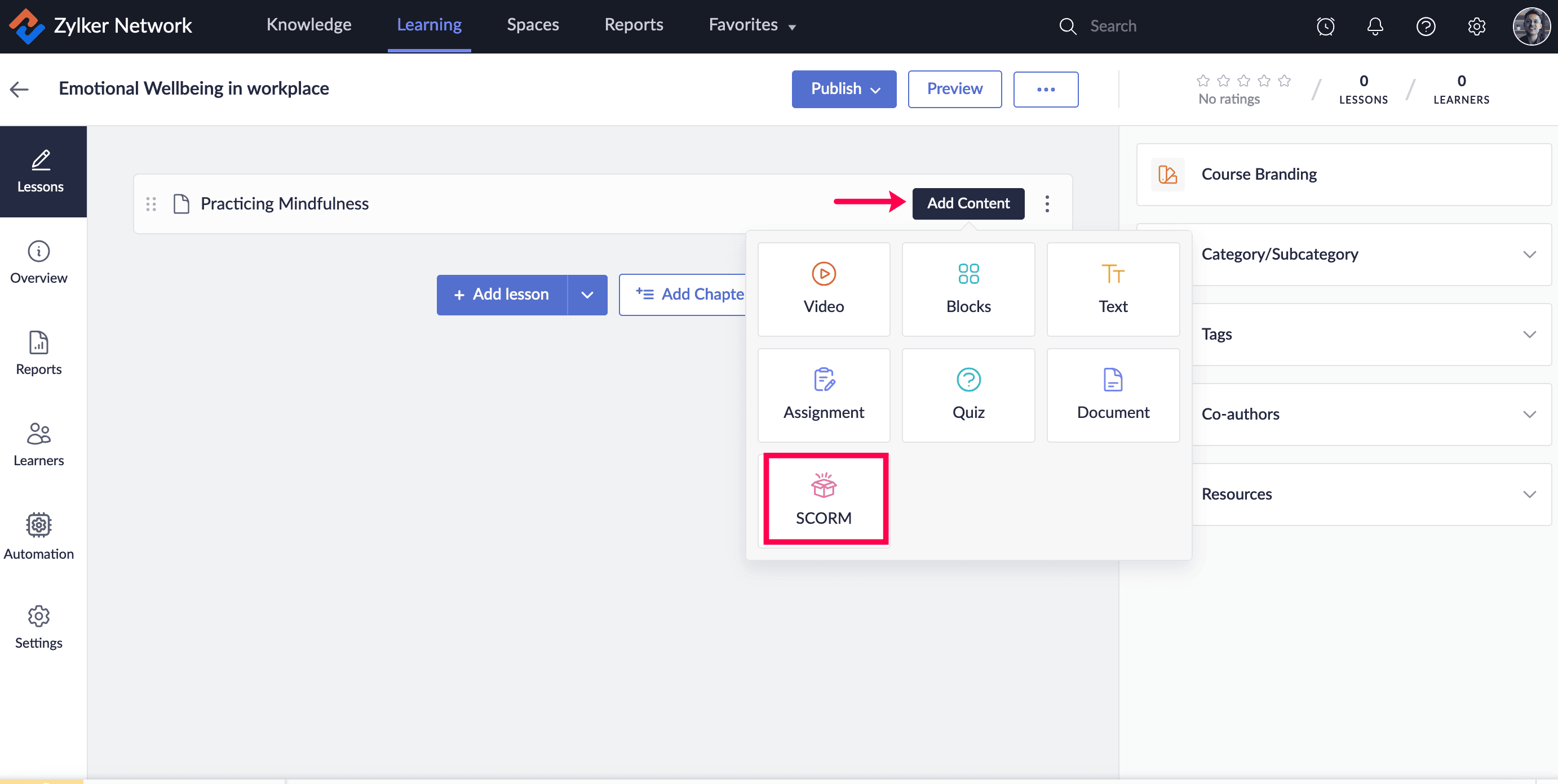 レッスンタブに移動し、SCORMレッスンをクリックします。