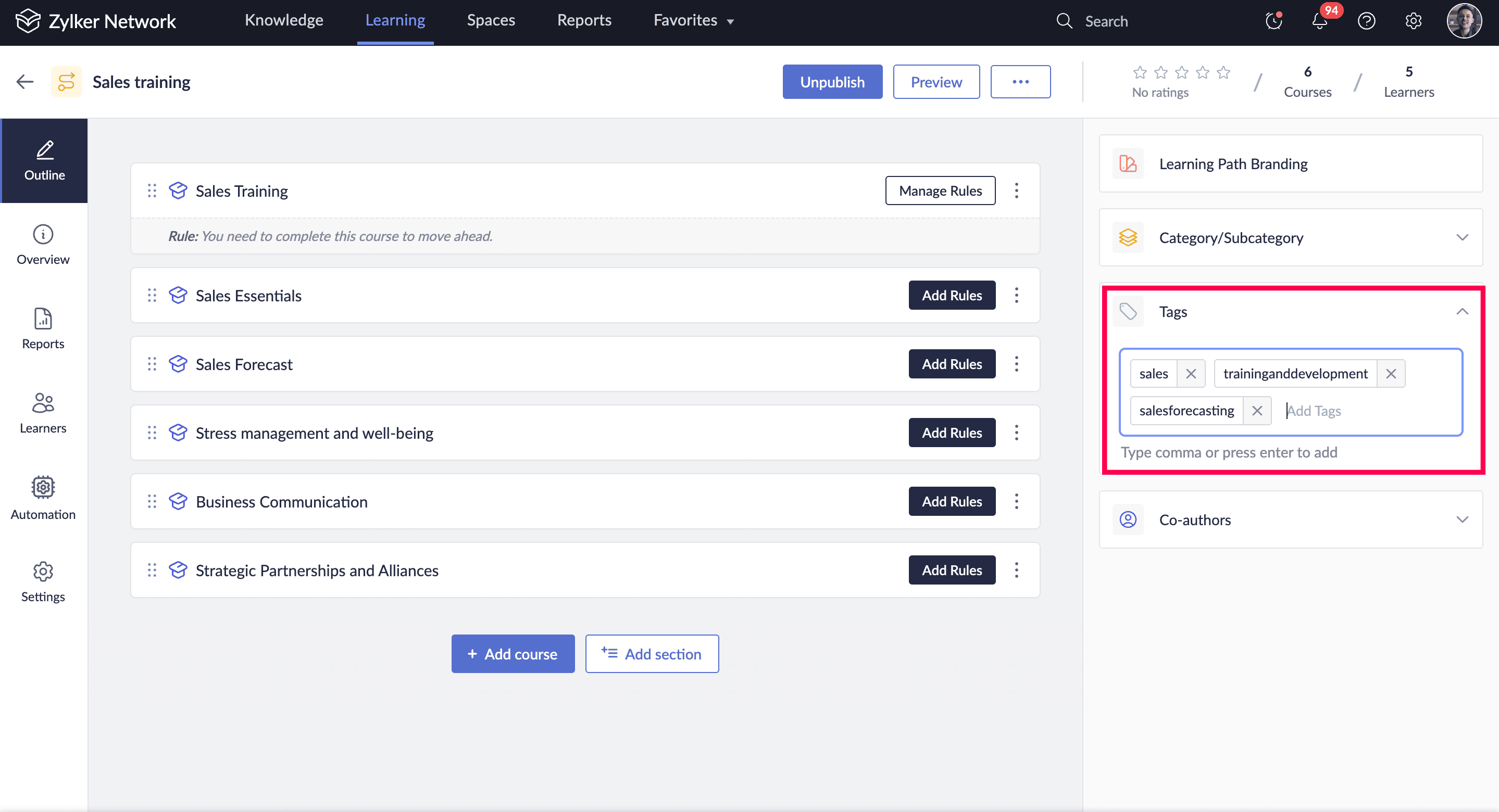 学習パスにタグを追加することで、受講者が検索する際にコースをより簡単に見つけられるようになります。