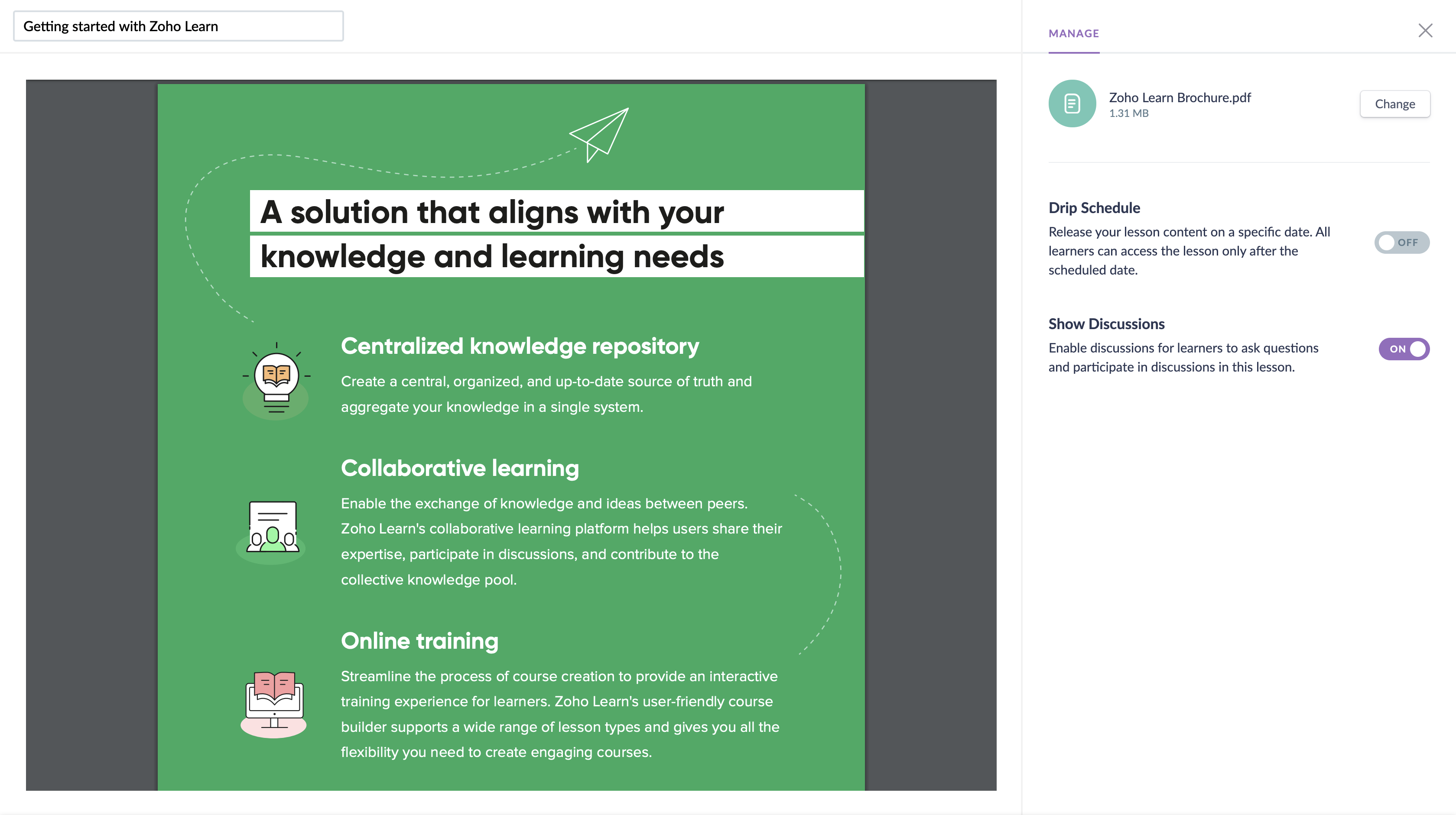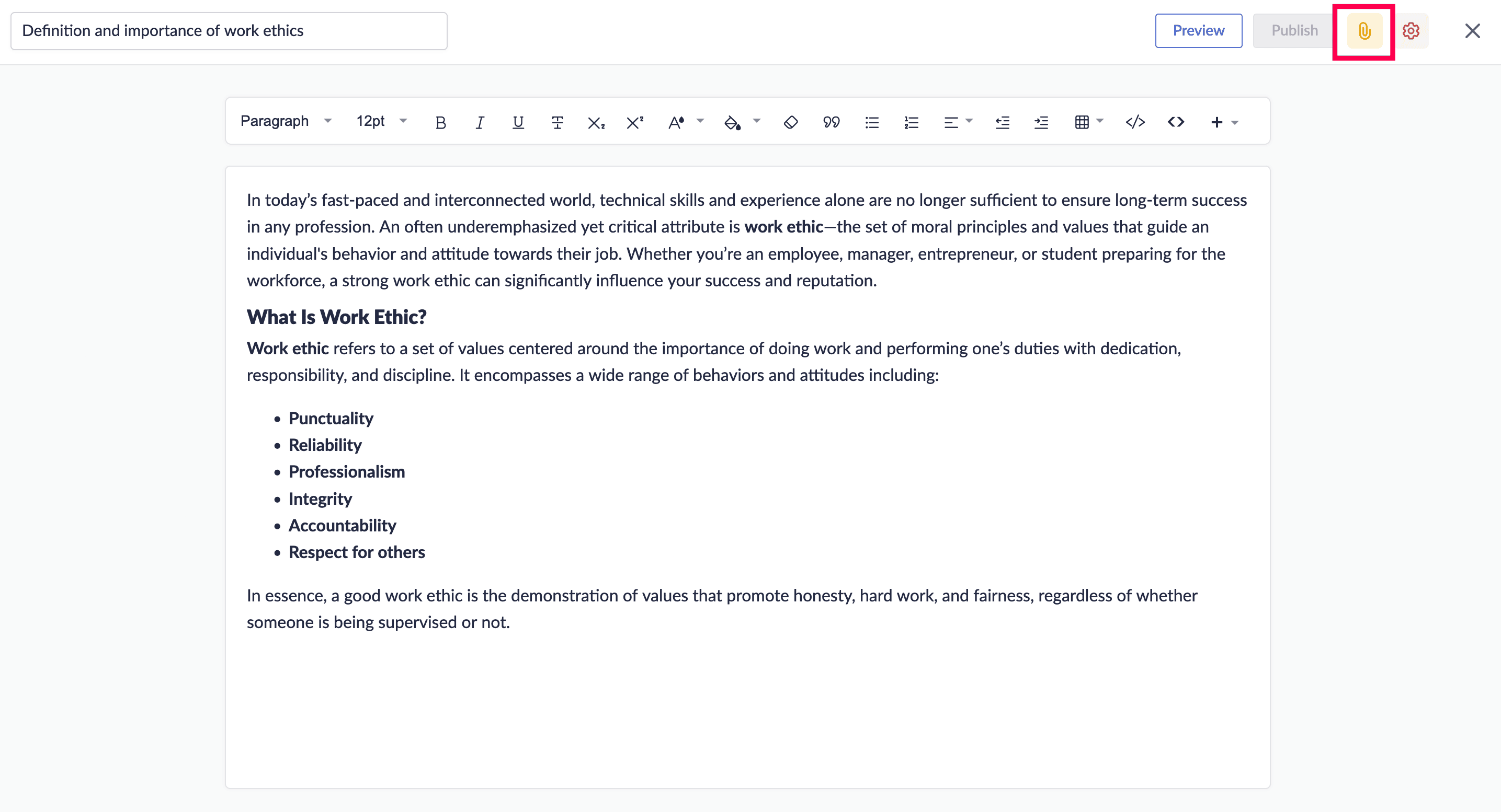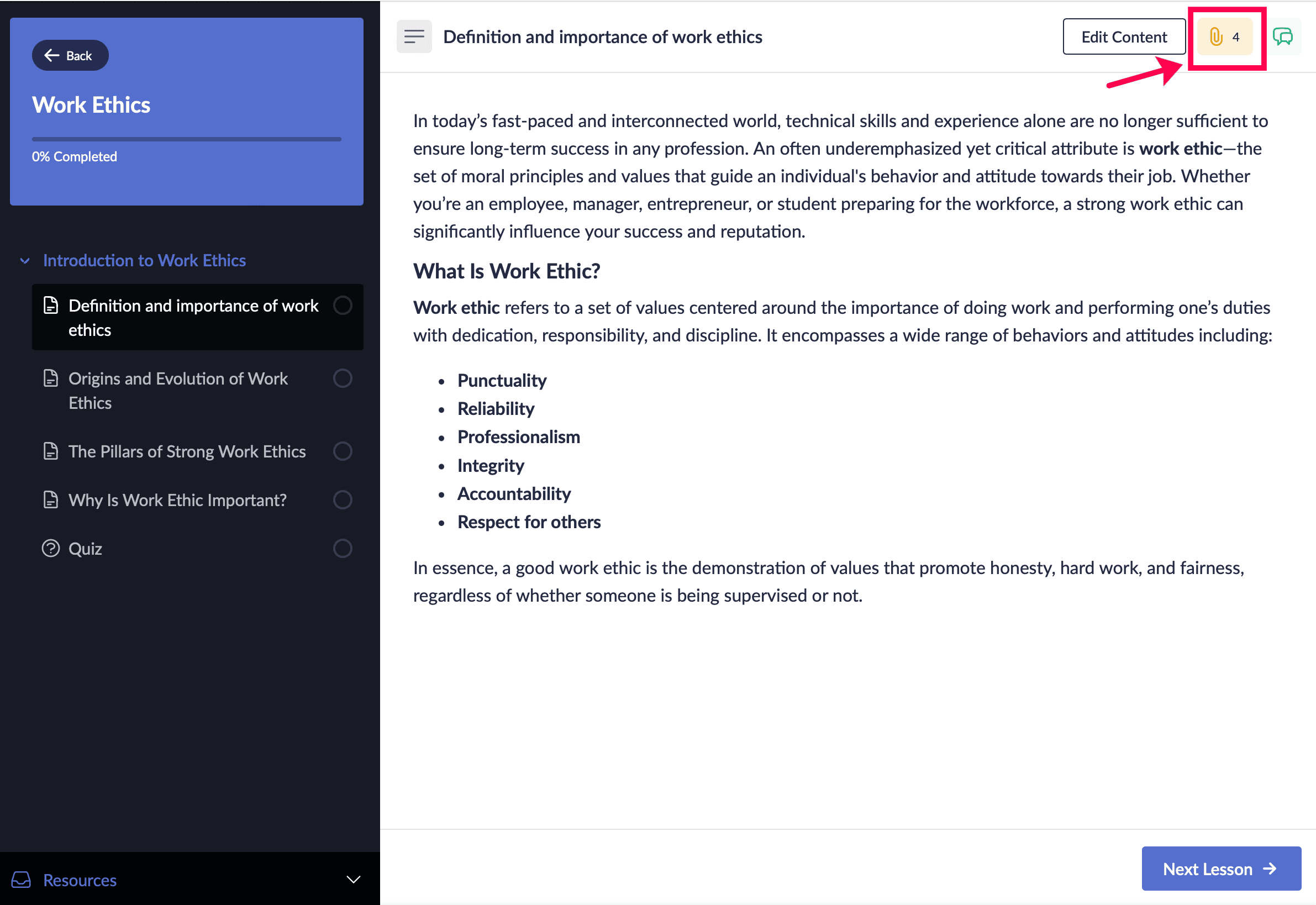 受講者は、レッスン閲覧時に添付ファイルアイコンをクリックすることで添付ファイルを表示できます。
