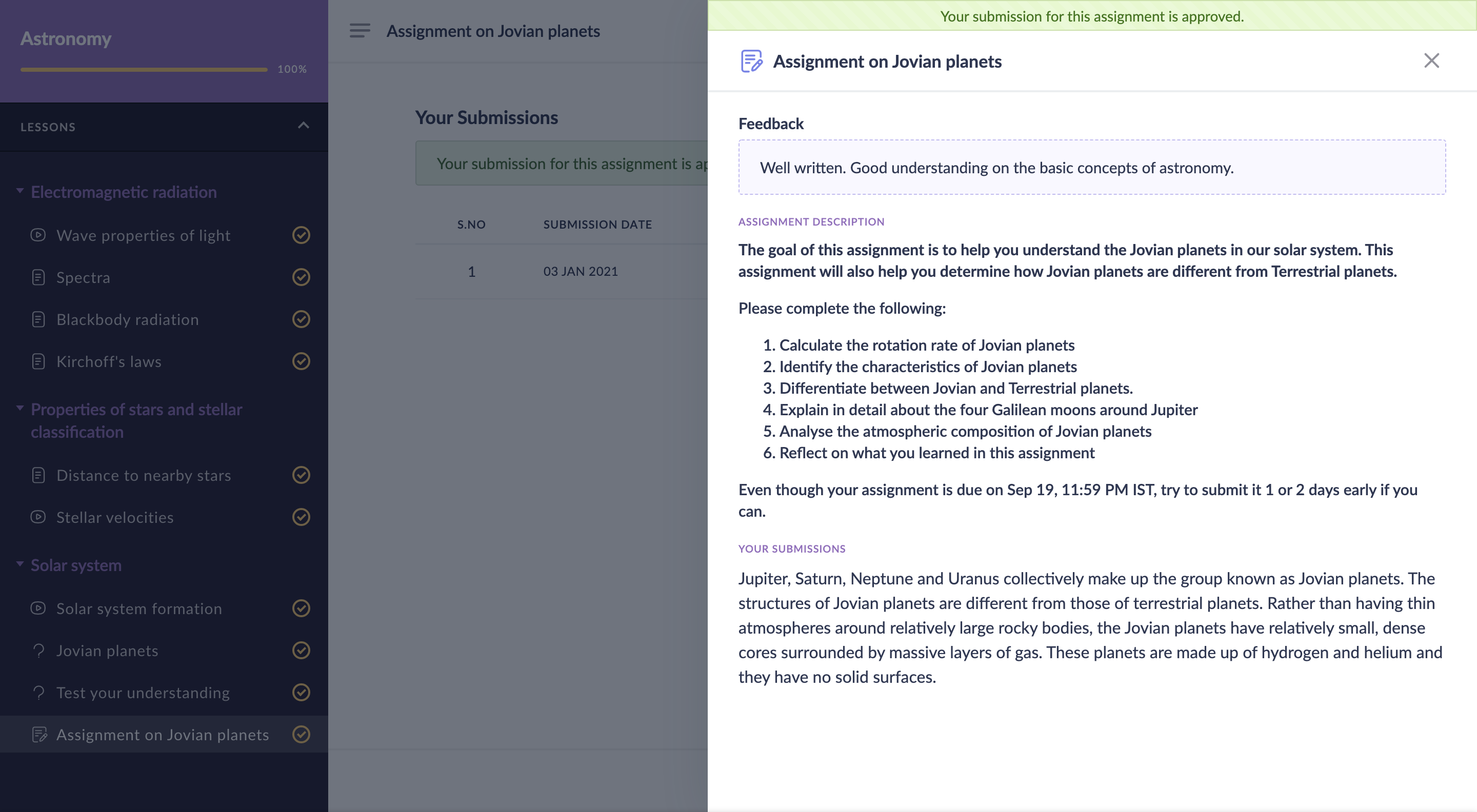 提出内容が評価された後は、課題ページで結果を確認し、提出内容をクリックしてフィードバックを表示できます。