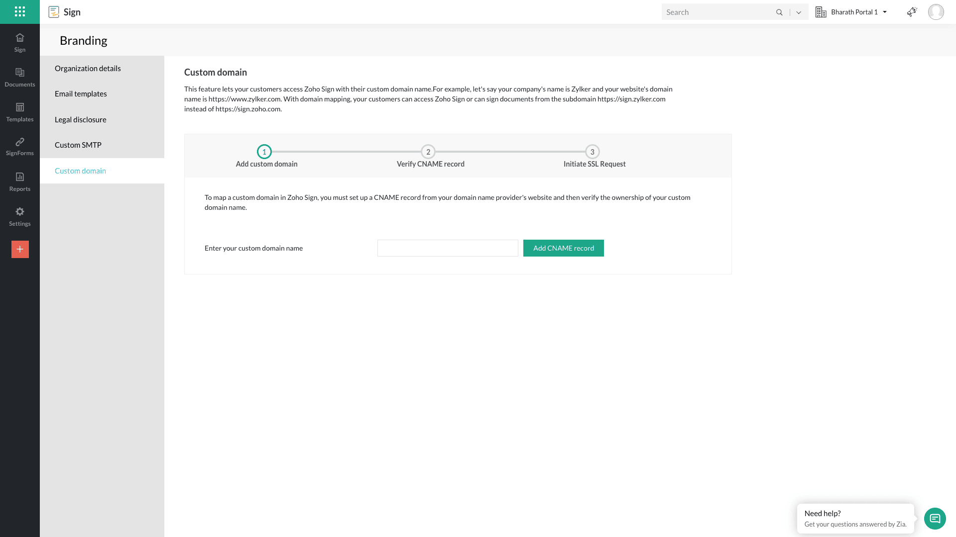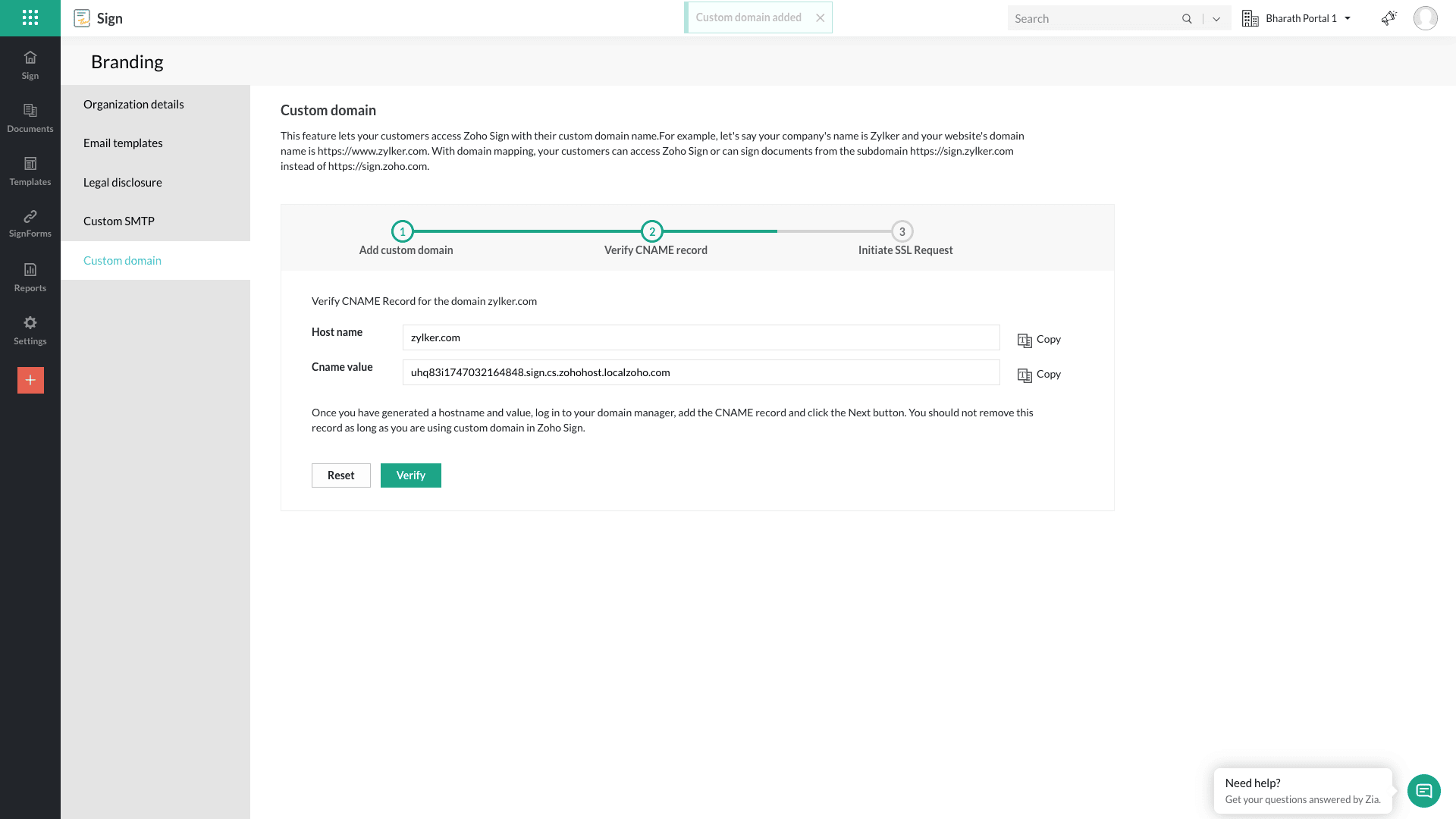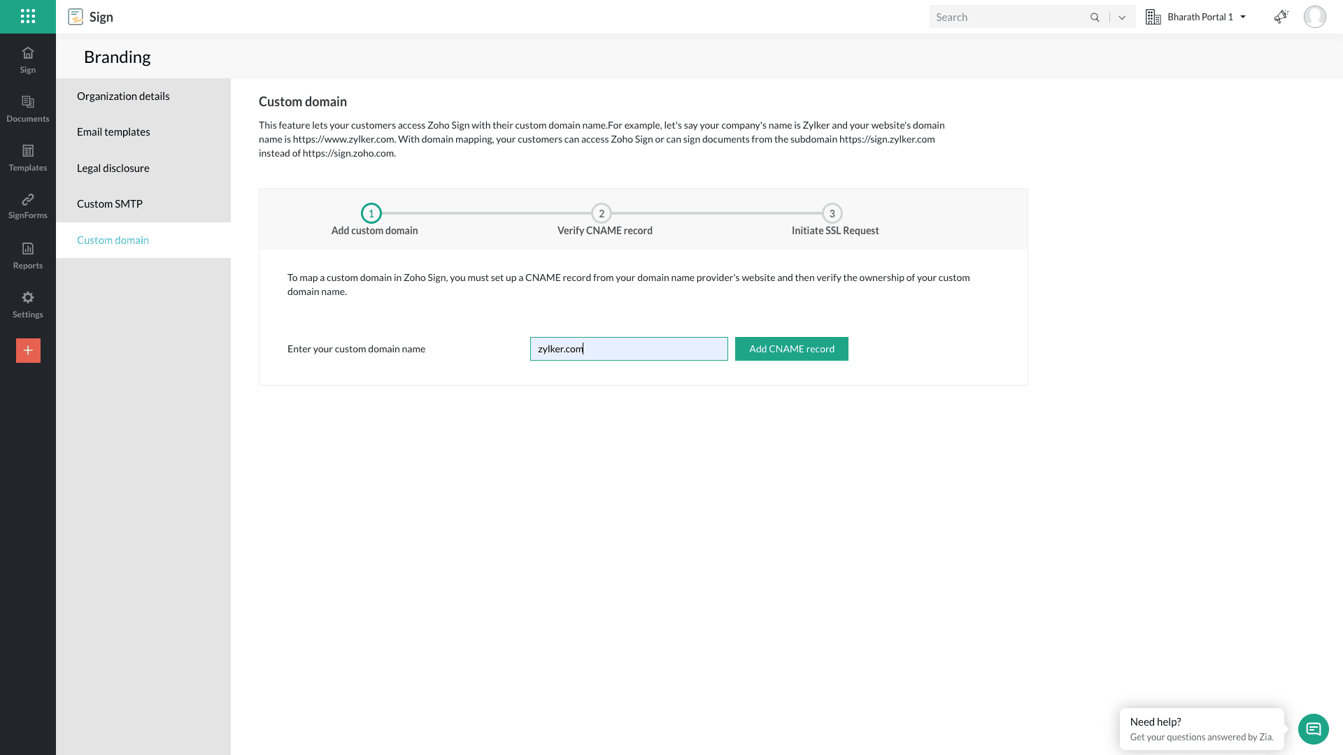 カスタムドメインを設定する前は、URLは sign.zoho.com のようになっています。会社名がZylker Corporationの場合、ドメイン設定後は、Zoho Signは sign.zylker.com からアクセスできるようになります。