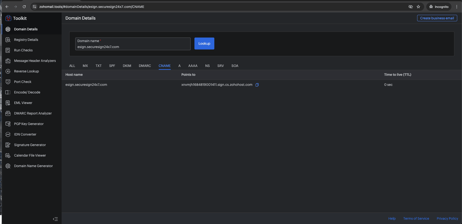 1. zohomail.toolsへアクセスし、カスタマイズしたドメインを入力します。CNAMEタブを選択し、「Lookup」をクリックしてください。データが表示されない場合は、TTLを確認するか、反映されるまでお待ちください。