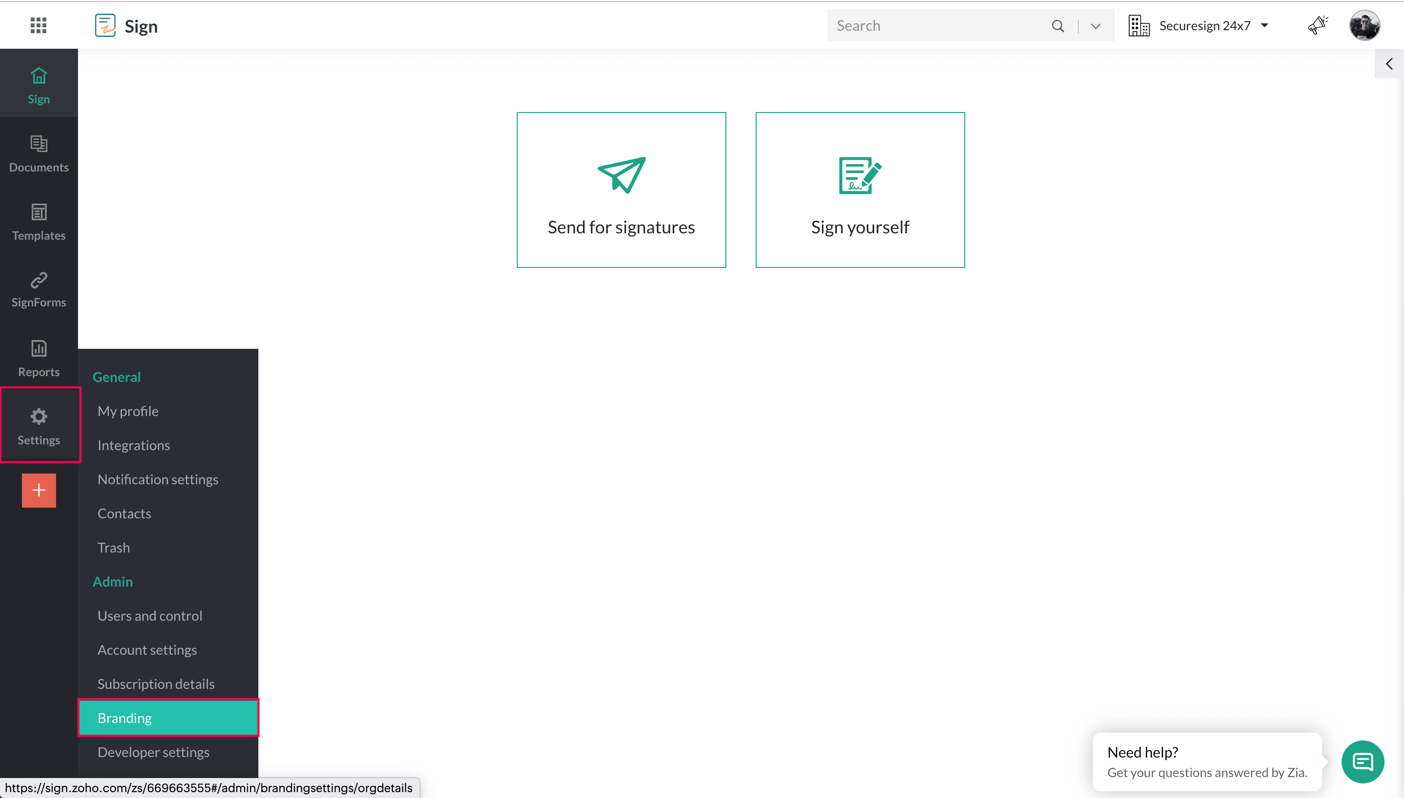 1. Zoho Sign ダッシュボードから、設定にカーソルを合わせ、ブランディングをクリックします。