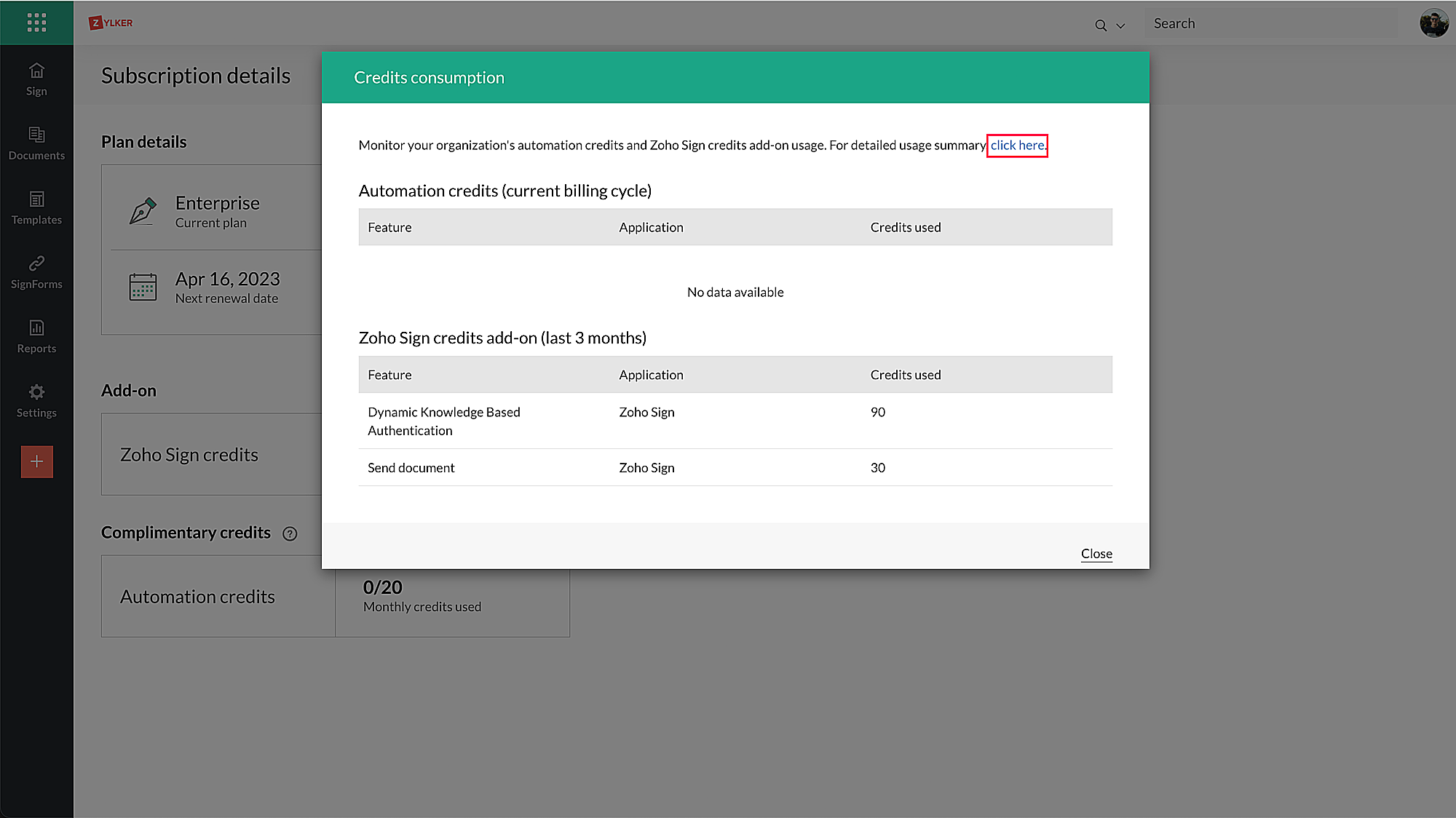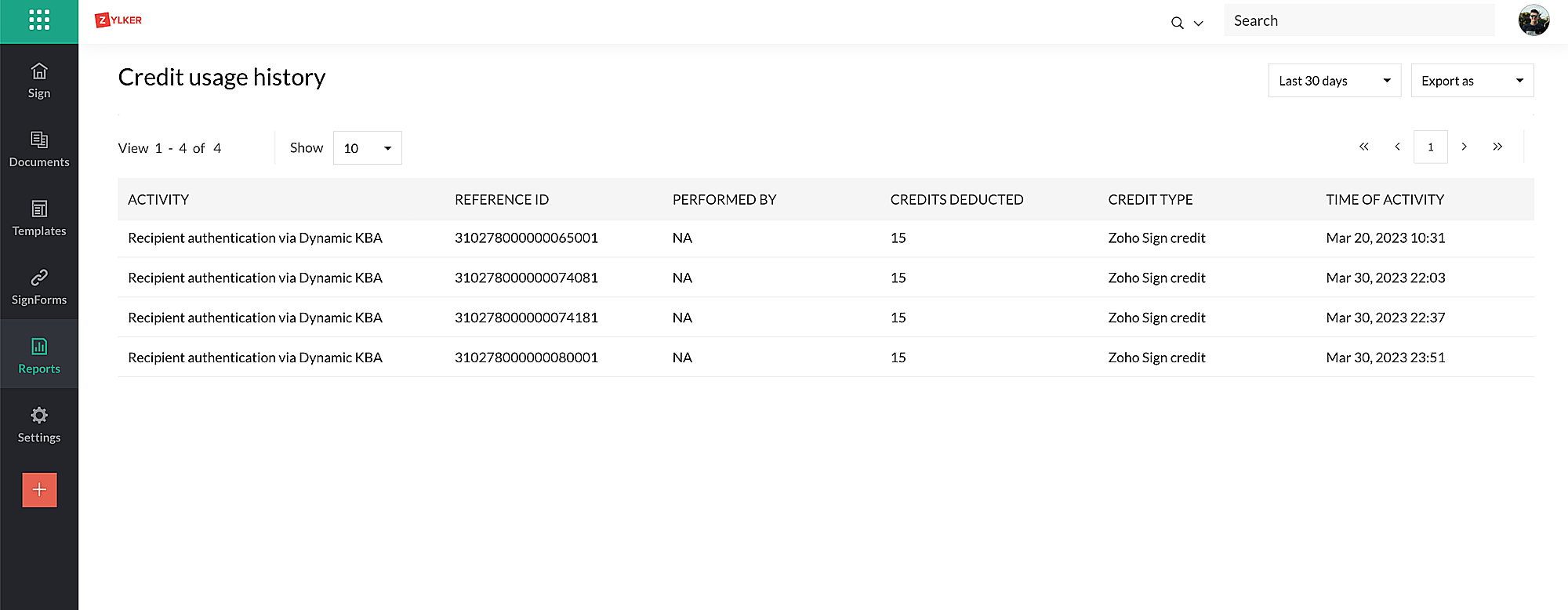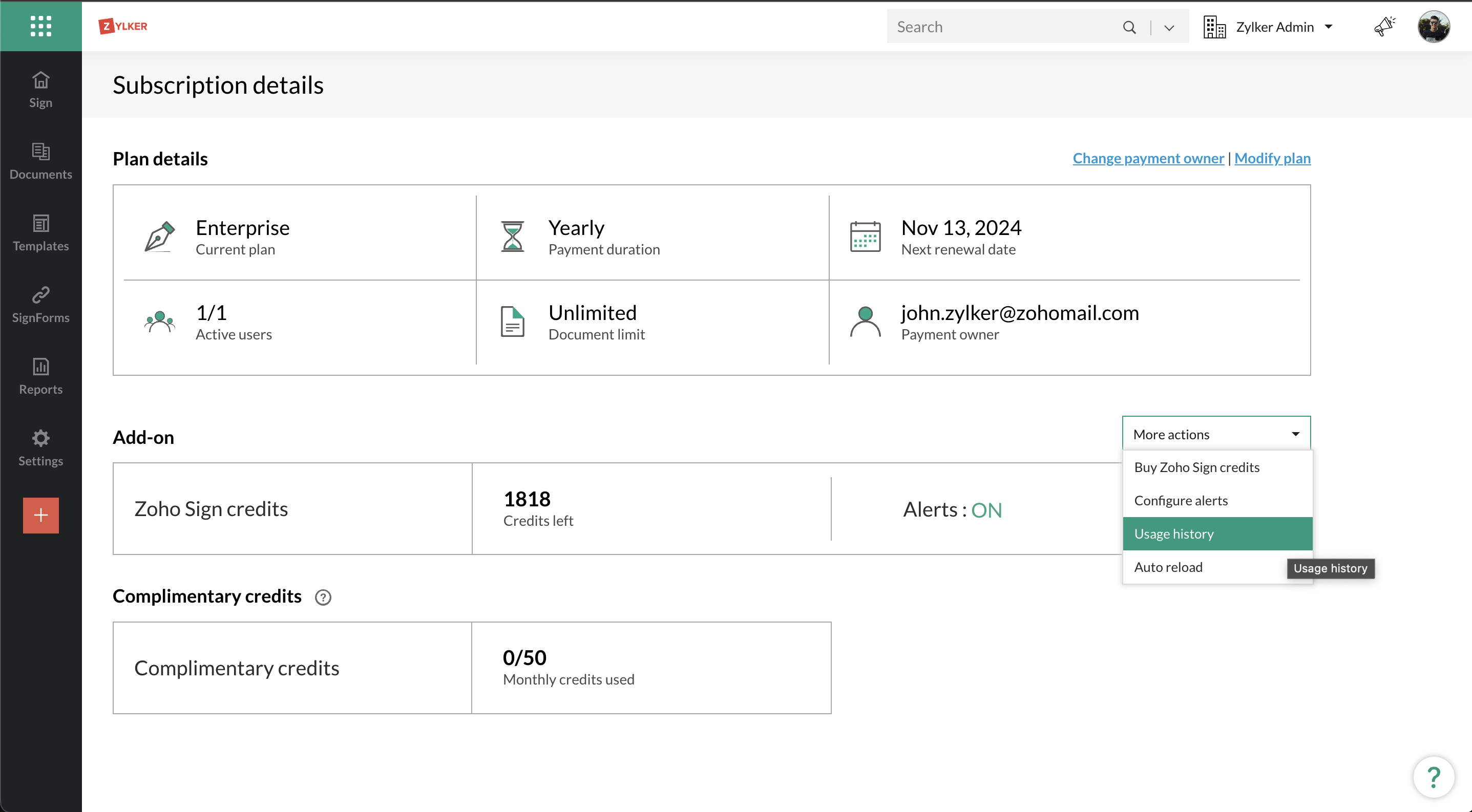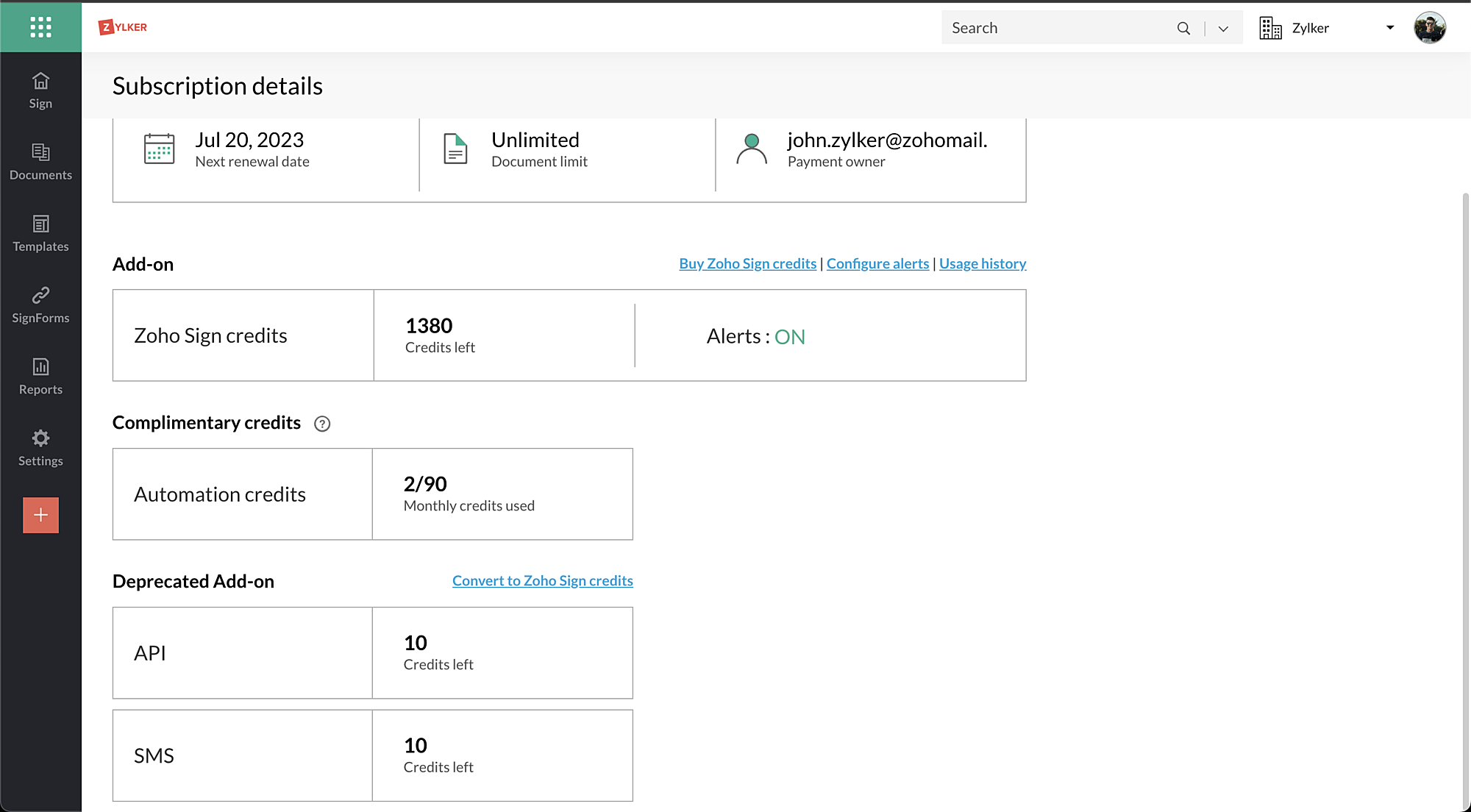 Zoho Sign クレジット利用状況の追跡