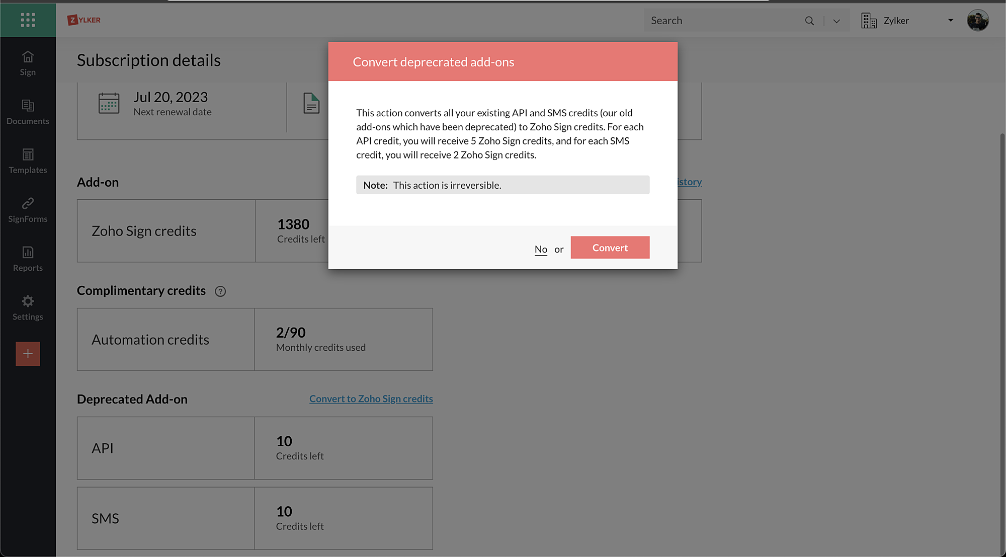 3. APIおよびSMSクレジットからZoho Signクレジットへの変換