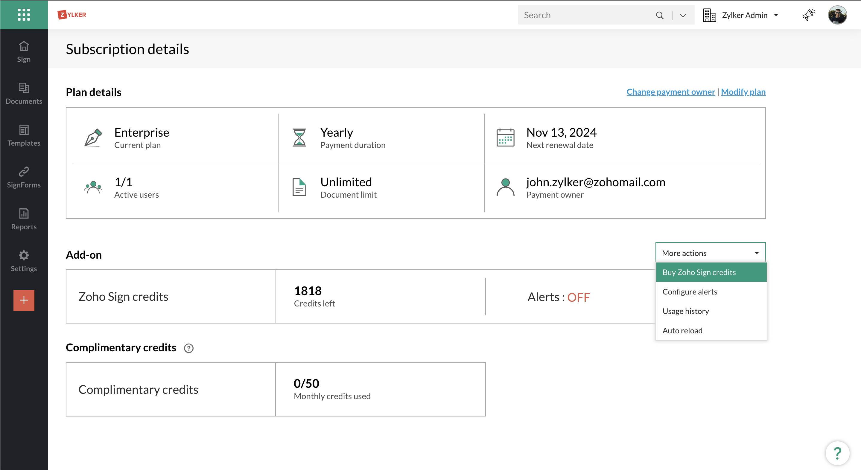 1. サブスクリプション詳細ページで、その他の設定ドロップダウンボタンをクリックし、Buy Zoho Signクレジットを選択してください。