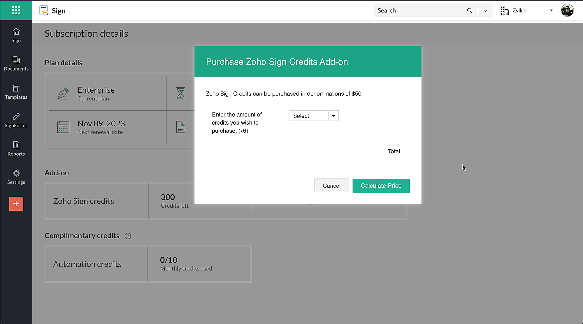 1. Zoho Signクレジットの購入