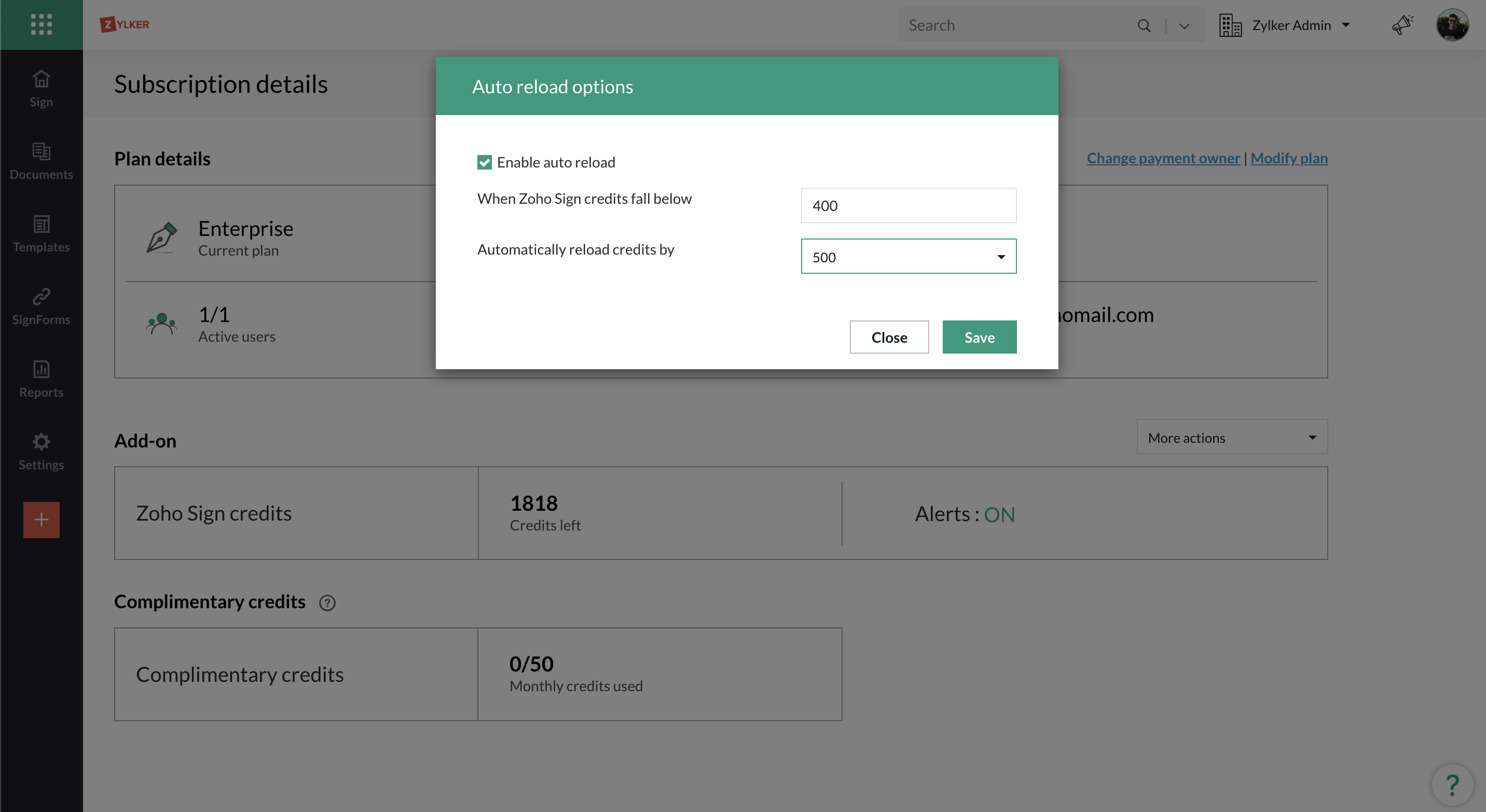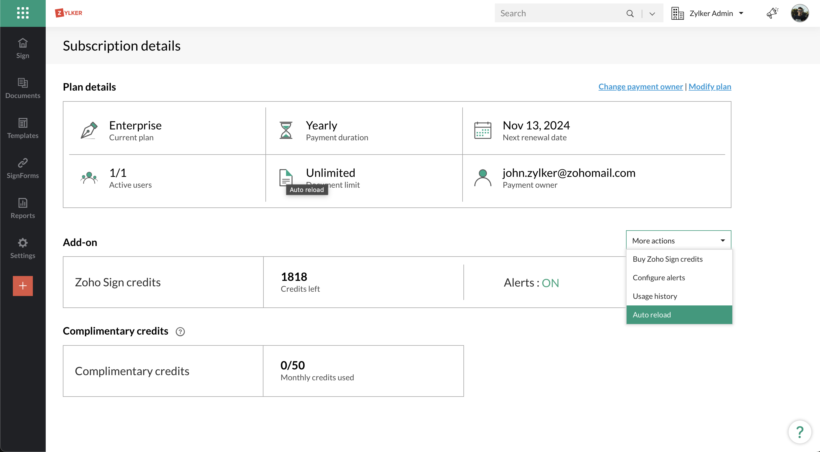 Zoho Sign クレジットの自動更新を有効にする