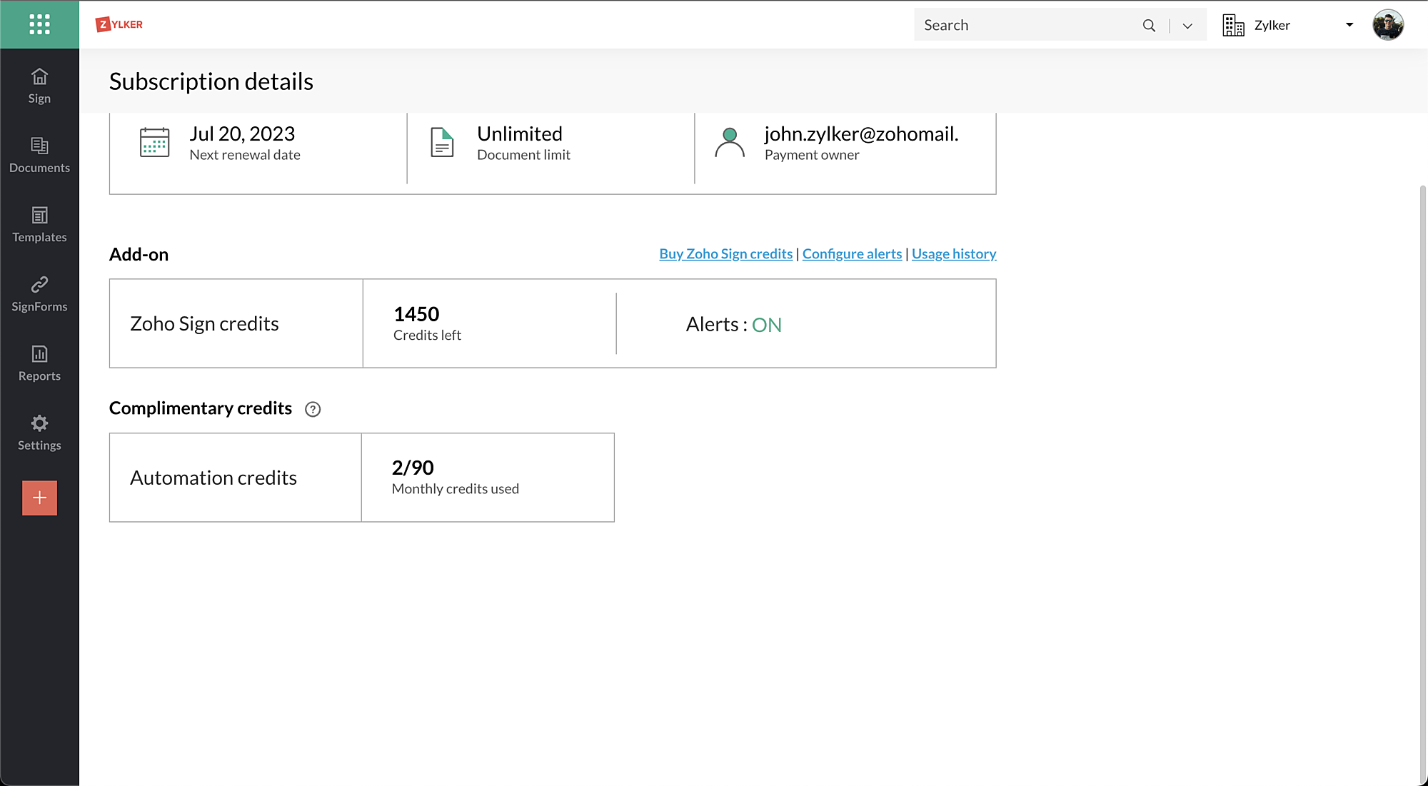 2. Zoho Signクレジットの利用状況の確認