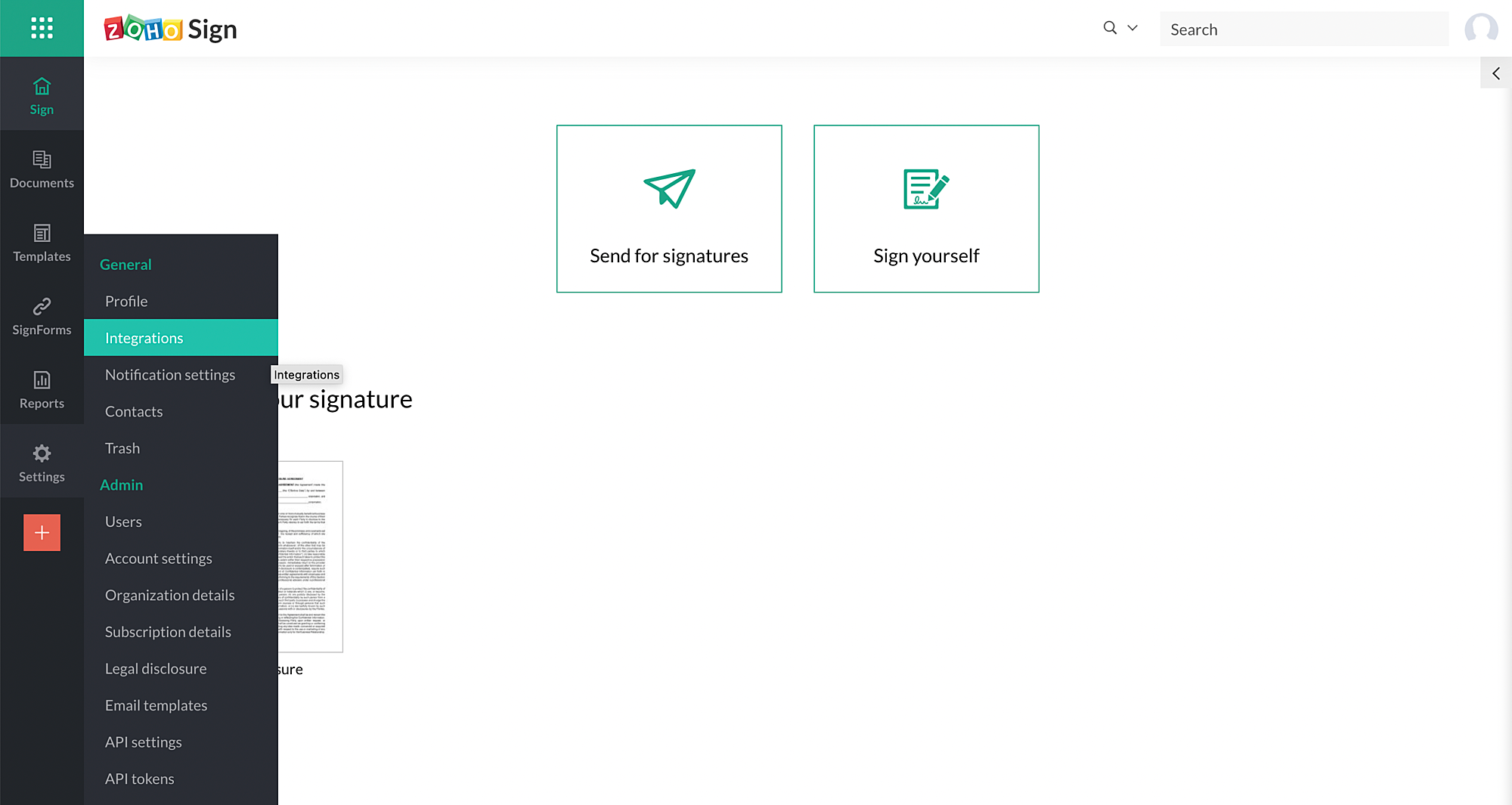 1. 左側のナビゲーションパネルから、「設定 > 統合」をクリックし、「Aadhaar Signing」をオンにします。これは組織の管理者のみが行うことができます。