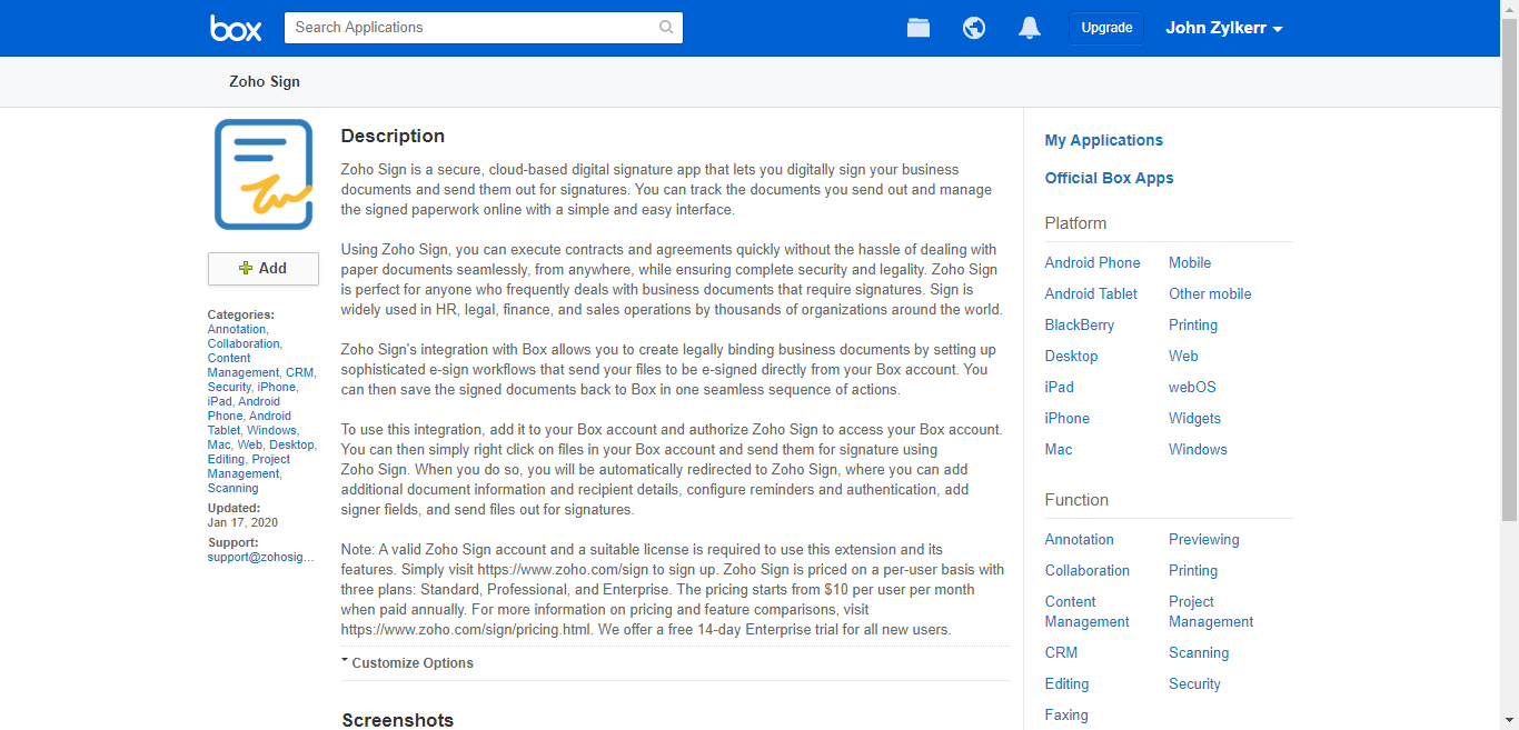 3. Zoho Sign を検索し、追加 ボタンをクリックします。 Zoho Sign への Box に保存されたドキュメントへのアクセスを許可します。