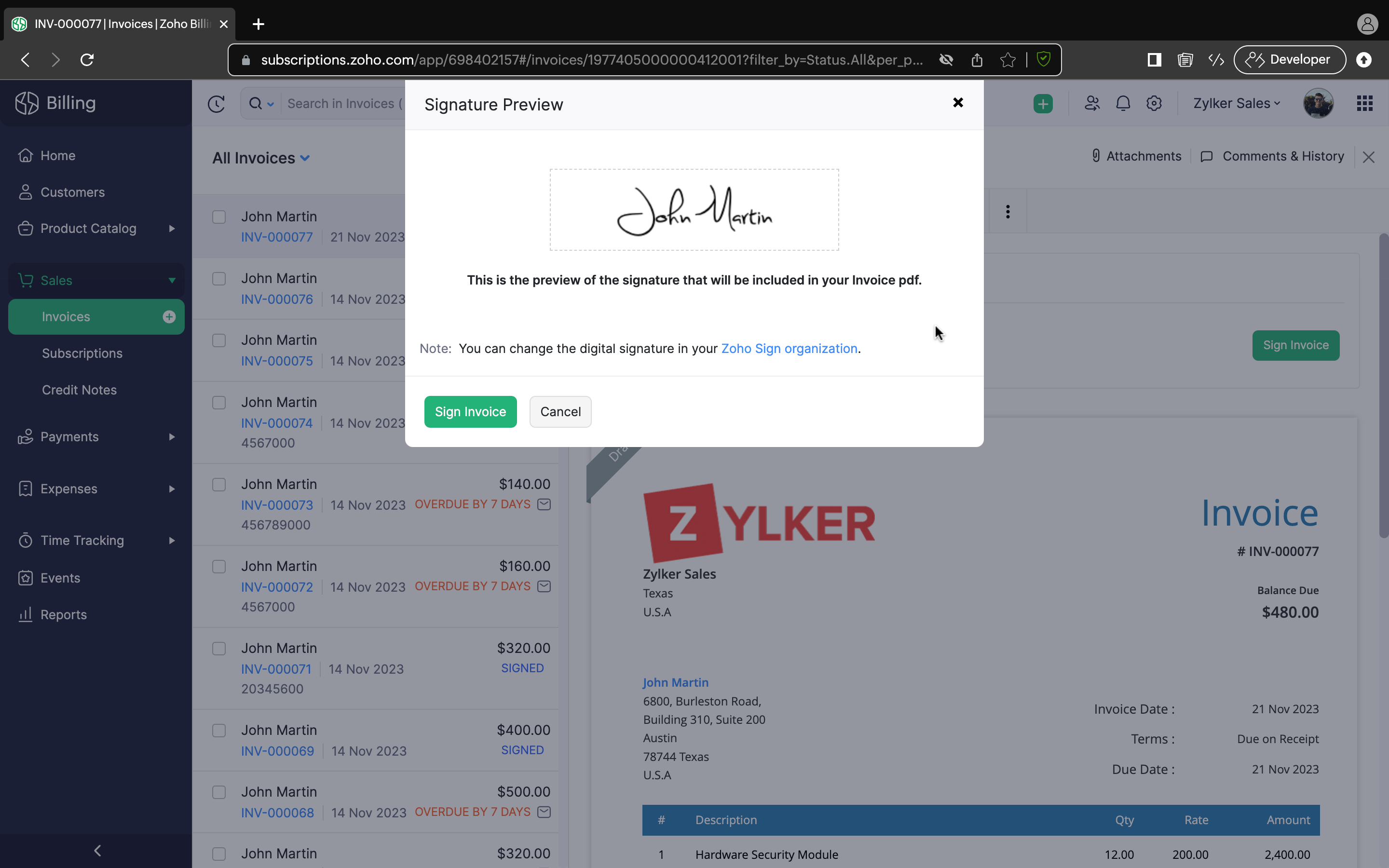 4. ポップアップで電子署名をプレビューし、請求書に署名するをクリックします。