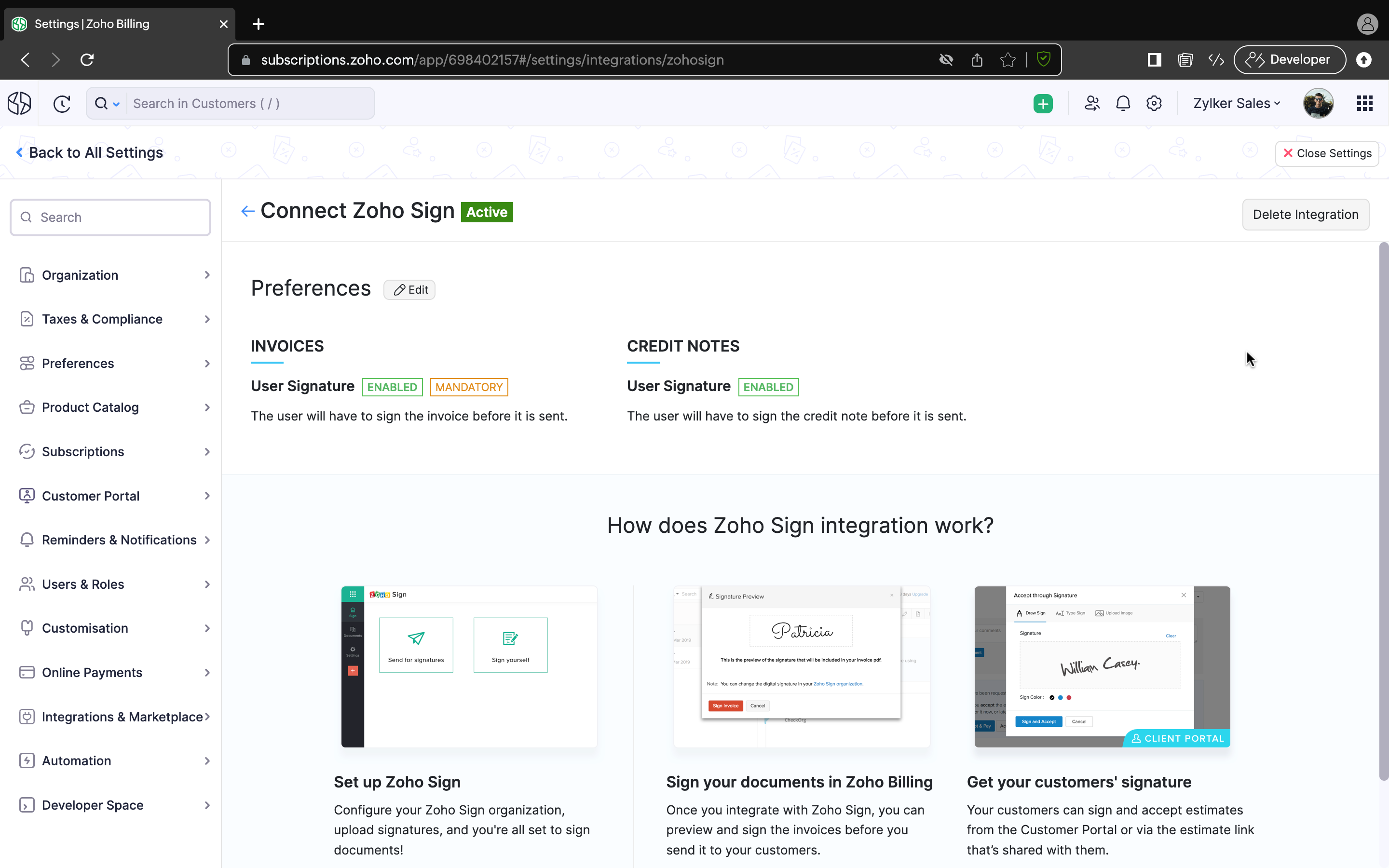 Zoho BillingでZoho Sign連携を有効にする手順