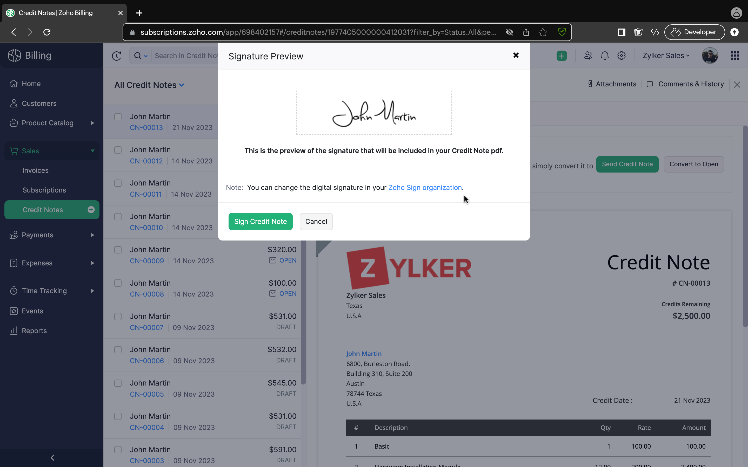 Zoho Billing を使用してクレジットノートに電子署名する手順