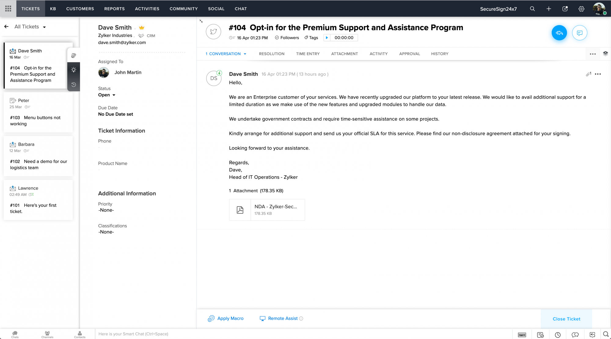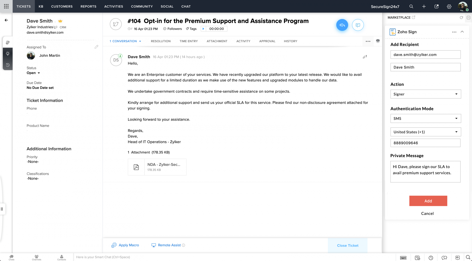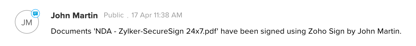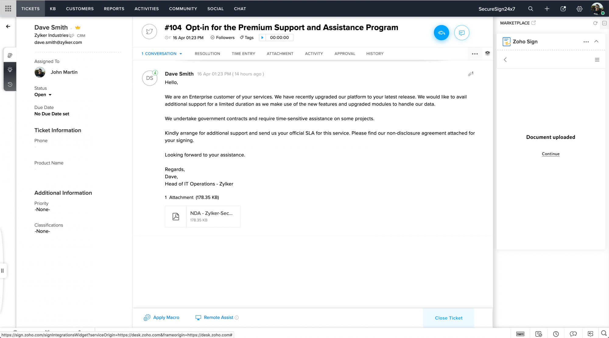 12. 署名を受け取った文書が正常に送信された場合、文書と送信者の詳細を含むコメントがチケットスレッドに自動的に追加されます。