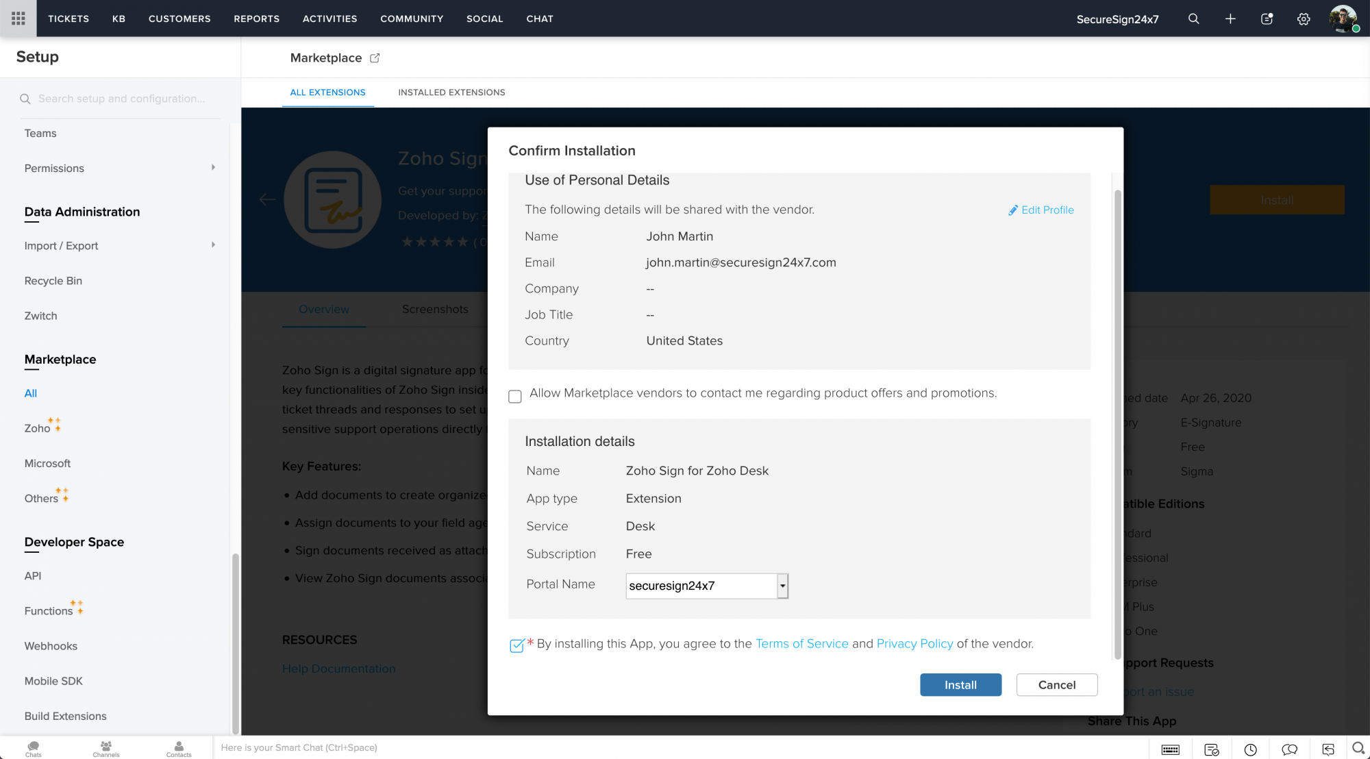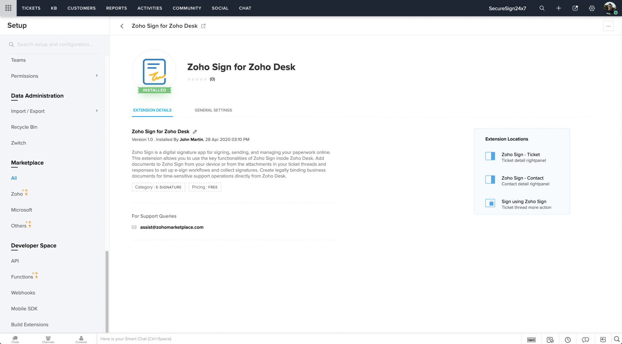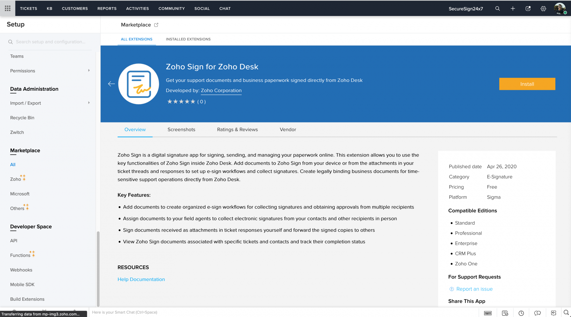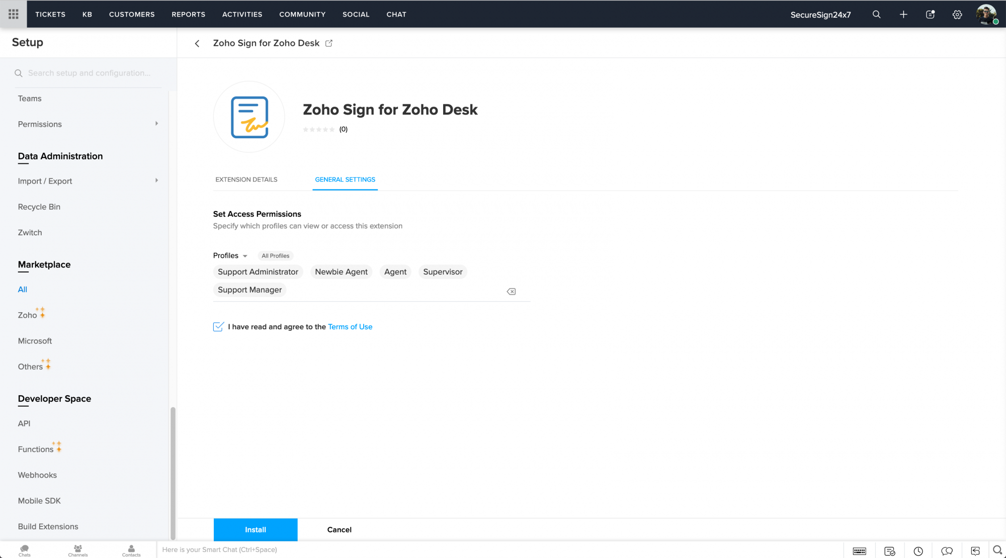 Zoho Desk に Zoho Sign 拡張機能をインストールする手順:
